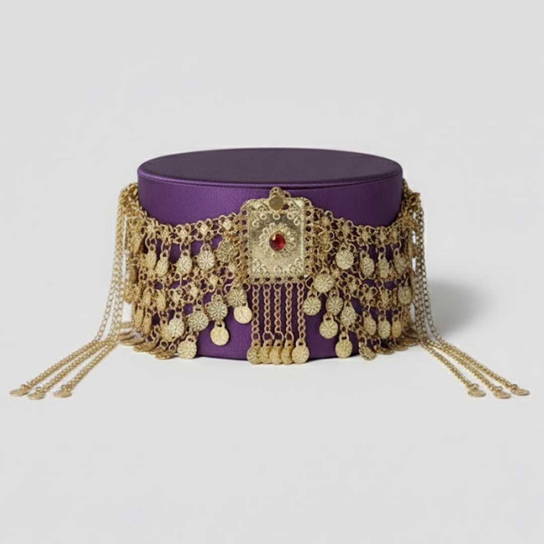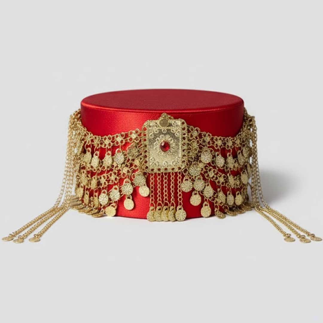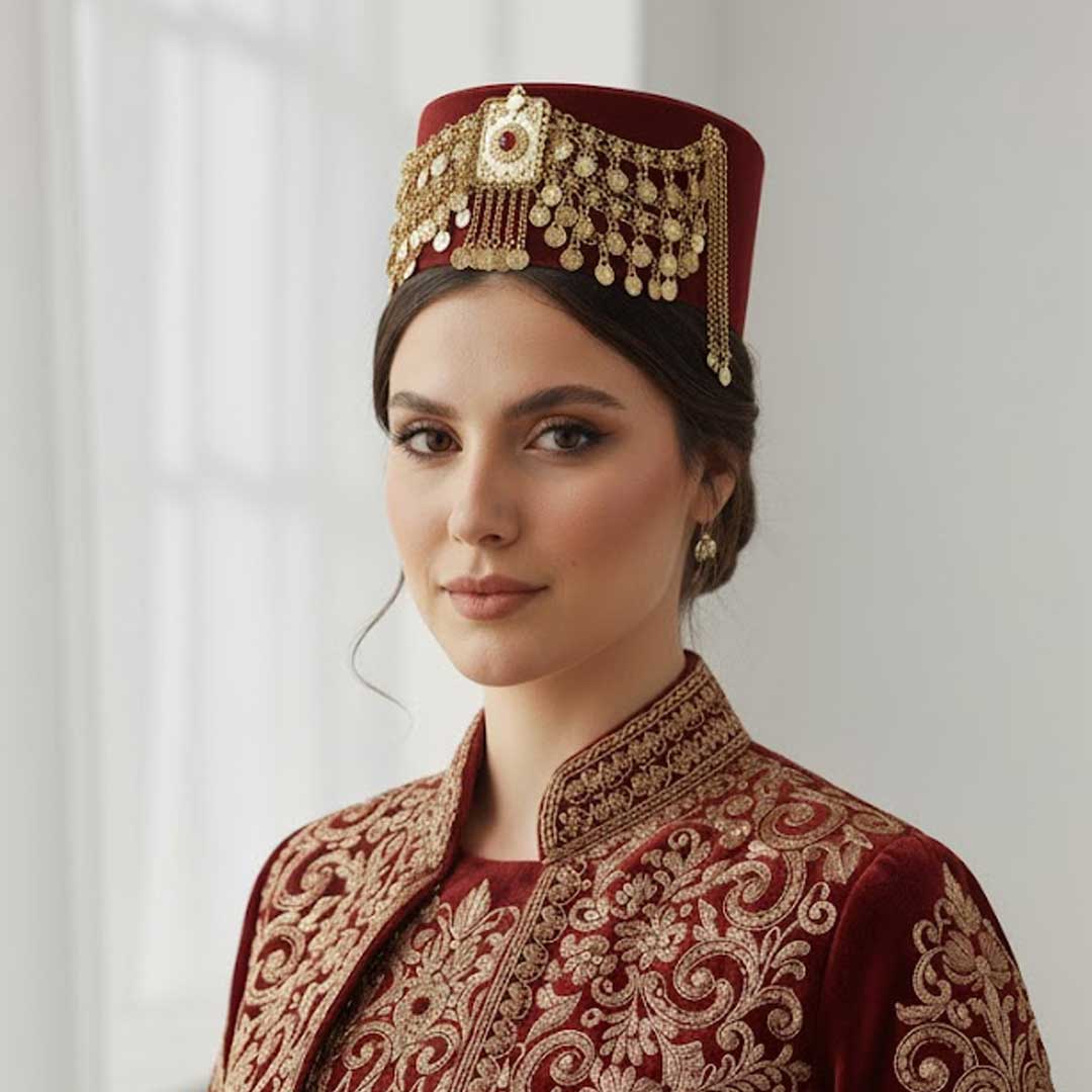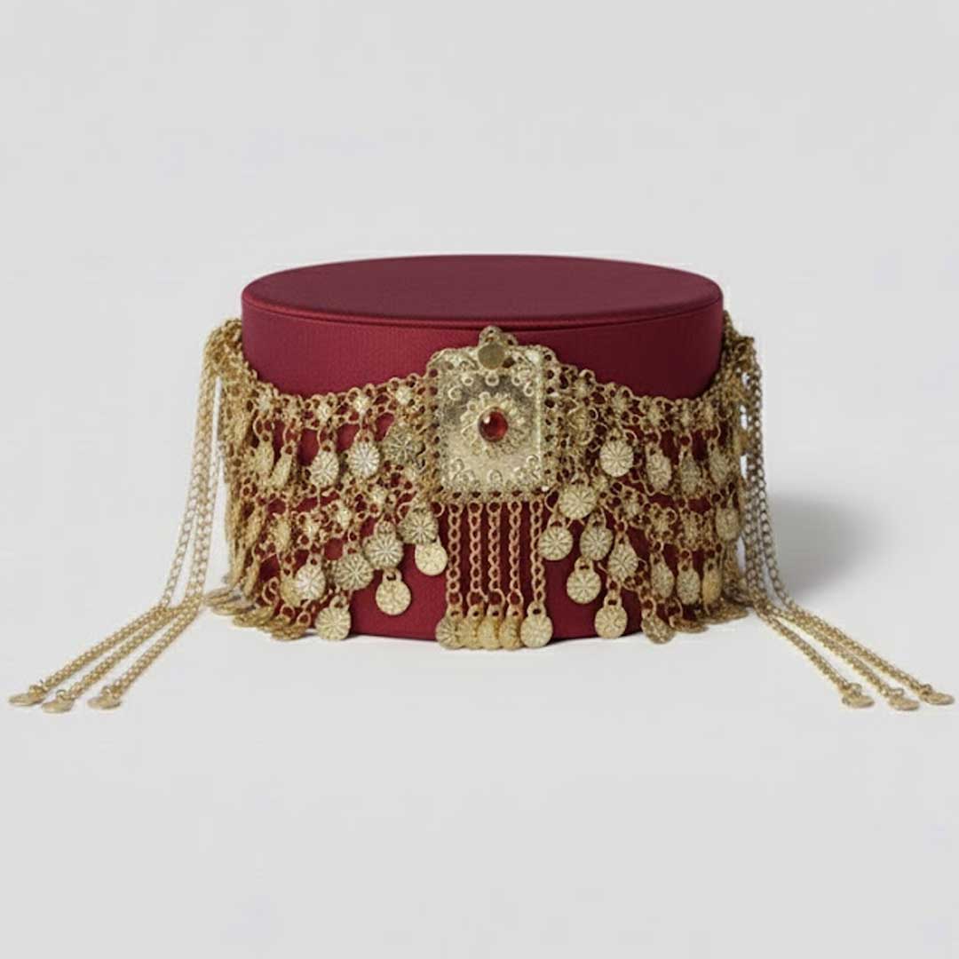 Mit filigranen Ketten, glänzenden Münzanhängern und roten Schmucksteinen verziert – perfekt, um den klassischen Fes für Henna-Abende, Hochzeiten oder folkloristische Auftritte zu schmücken.