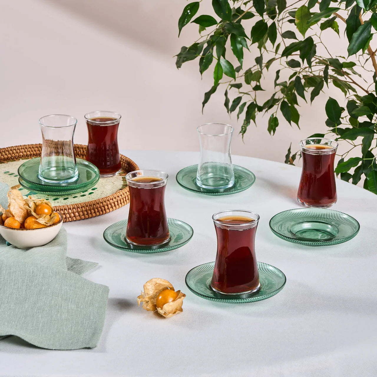Das Juliet Teeset von Karaca in elegantem Grün verleiht Ihrer Teestunde einen Hauch von Stil und Raffinesse. Dieses 12-teilige Set für 6 Personen besteht aus 6 Teegläsern und 6 passenden Untertassen, ideal für den täglichen Gebrauch oder besondere Anlässe. Mit einem Fassungsvermögen von ca. 165 ml pro Glas bietet es ausreichend Platz für Ihren Lieblingstee.