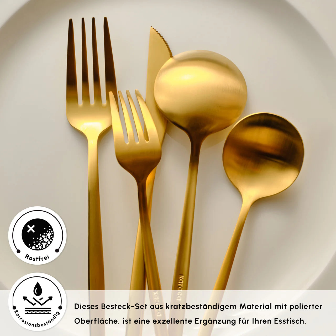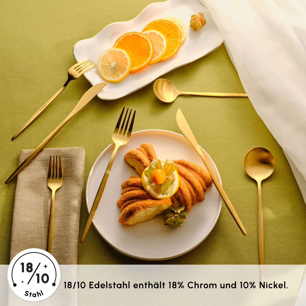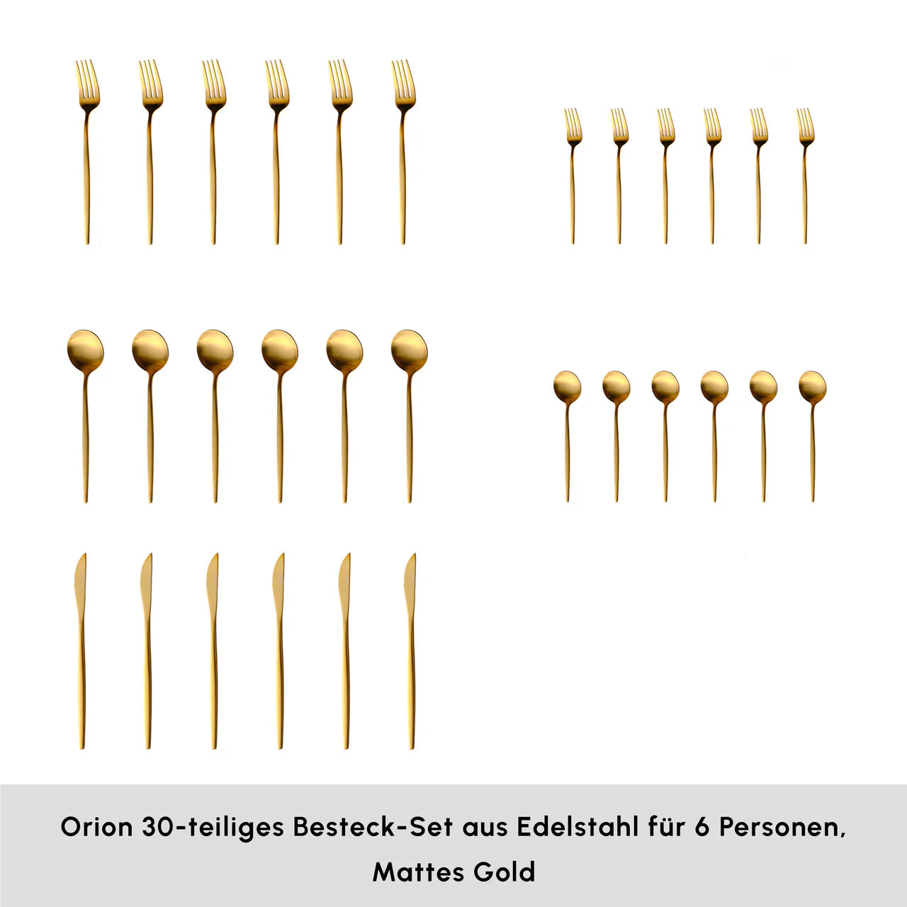 Das Orion Mattgold Besteckset bringt stilvolle Eleganz auf jeden gedeckten Tisch. Mit seiner matten Goldoptik verleiht es sowohl Alltagsmahlzeiten als auch festlichen Anlässen eine exklusive Note. Das 30-teilige Set ist für 6 Personen konzipiert und überzeugt durch sein modernes Design, ergonomische Griffe und hochwertige Verarbeitung aus rostfreiem Edelstahl. Dank der widerstandsfähigen Beschichtung und der spuelmaschinengeeigneten Oberfläche ist es nicht nur optisch ein Highlight, sondern auch praktisch im täglichen Gebrauch.