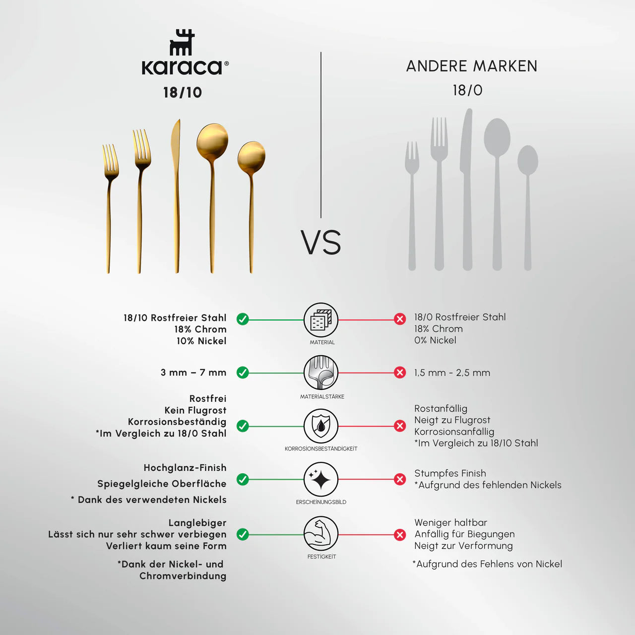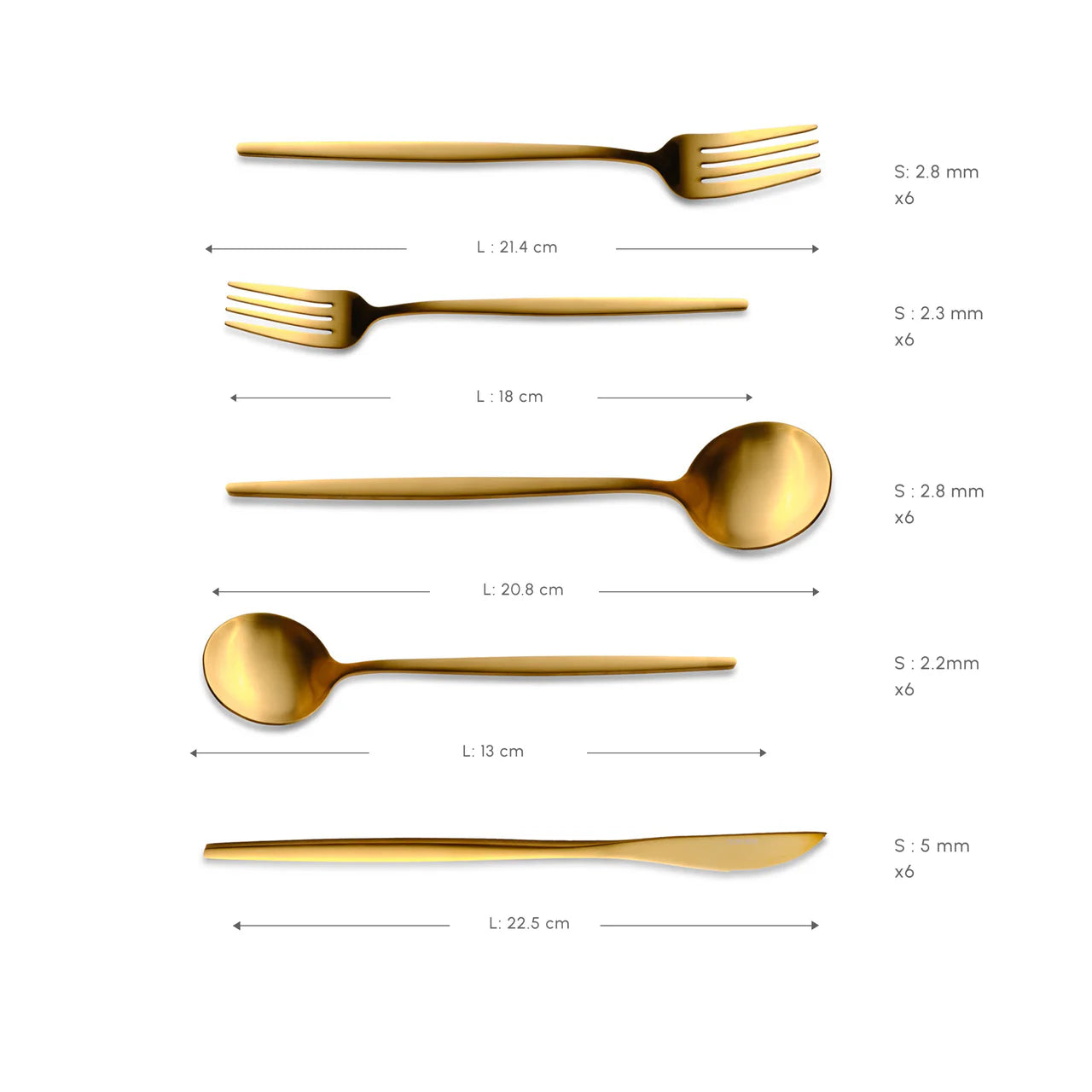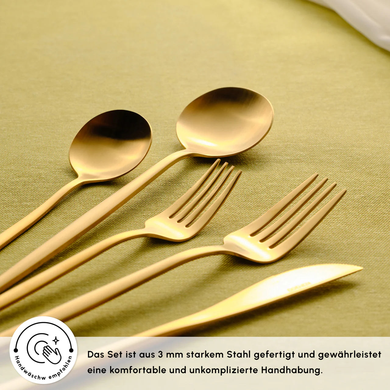 Das Orion Mattgold Besteckset bringt stilvolle Eleganz auf jeden gedeckten Tisch. Mit seiner matten Goldoptik verleiht es sowohl Alltagsmahlzeiten als auch festlichen Anlässen eine exklusive Note. Das 30-teilige Set ist für 6 Personen konzipiert und überzeugt durch sein modernes Design, ergonomische Griffe und hochwertige Verarbeitung aus rostfreiem Edelstahl. Dank der widerstandsfähigen Beschichtung und der spuelmaschinengeeigneten Oberfläche ist es nicht nur optisch ein Highlight, sondern auch praktisch im täglichen Gebrauch.