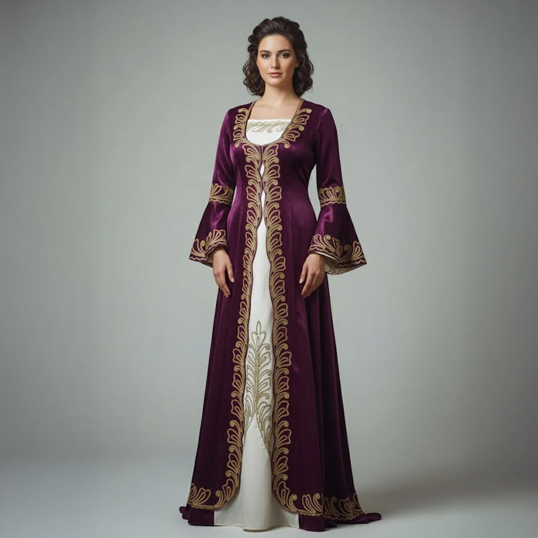 Farbe: Dunkelviolettt mit cremefarbenem Einsatz und goldener Stickerei