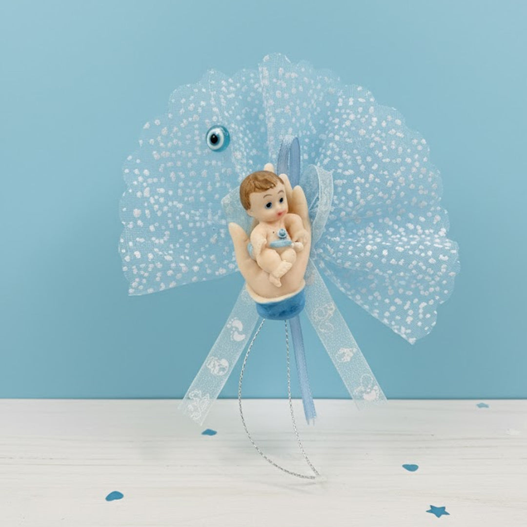 Diese liebevolle magnetische Figur zeigt ein süsses Baby in einer Hand, umgeben von zartem hellblau Glitzertüll und Satinbändern – ein wunderschönes Detail für jede Babyfeier oder als Gastgeschenk zur Geburt eines Mädchens.