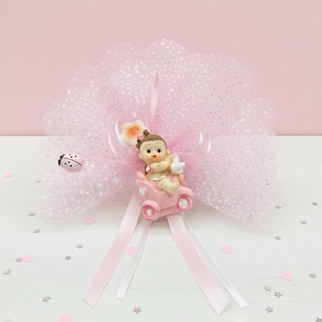 Diese süsse magnetische Dekofigur zeigt ein fröhliches Baby im rosa Auto – ein liebevolles Detail für jede Babyfeier oder als Gastgeschenk zur Geburt eines Mädchens.