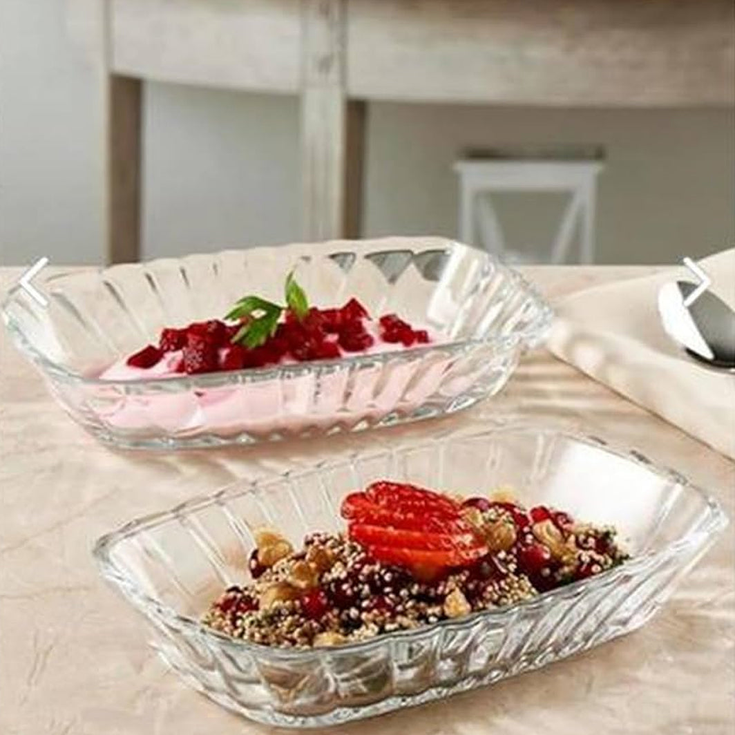 Das Mezze Schalen-Set ist ideal für die stilvolle Präsentation von Vorspeisen, Dips oder Desserts. Jede Schale misst ca. 18 cm x 11,5 cm und besteht aus hochwertigem Glas, das sowohl robust als auch spülmaschinengeeignet ist. Mit ihrem eleganten Design fügen sich die Schalen nahtlos in jede Tischdekoration ein und sind perfekt für den täglichen Gebrauch oder besondere Anlässe.