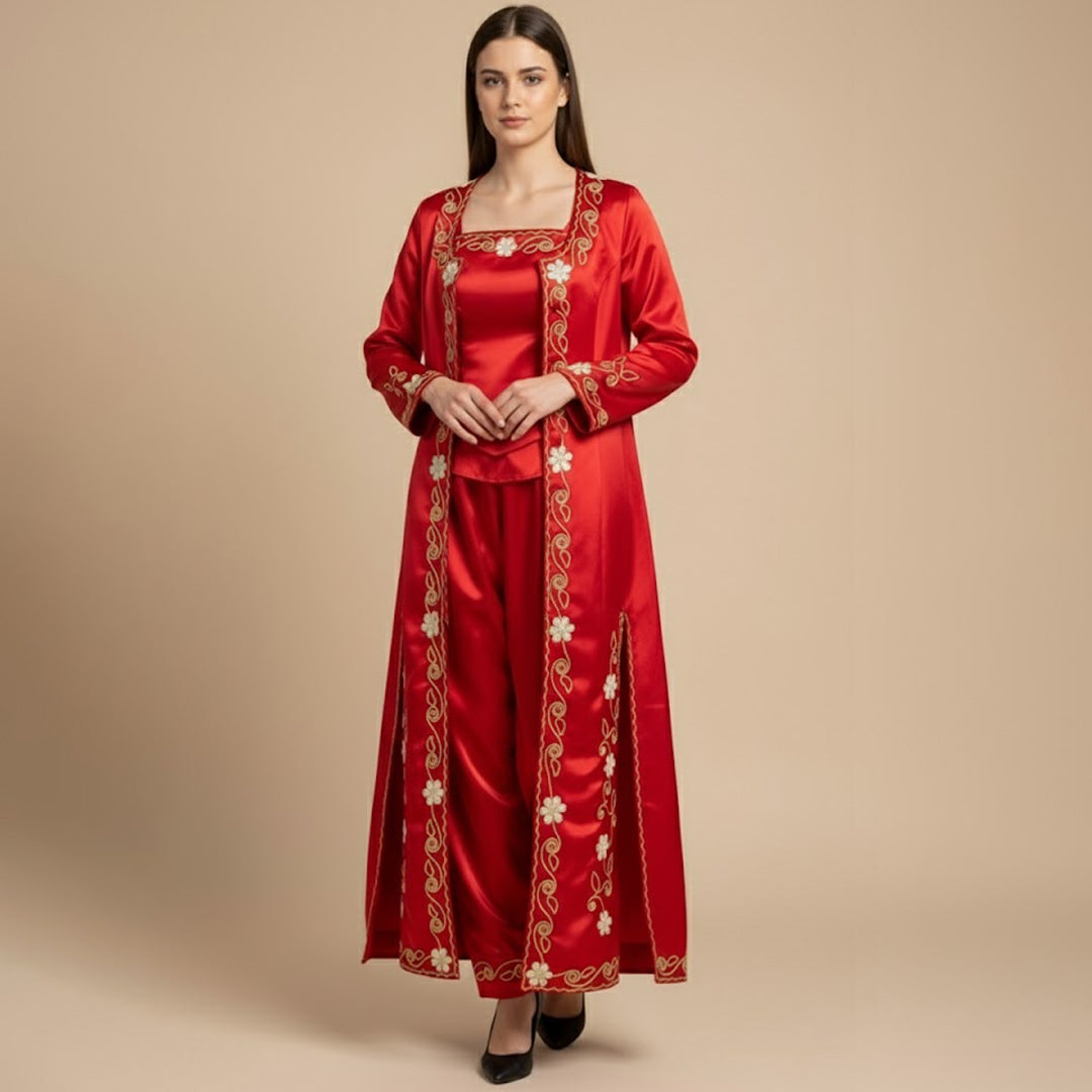 Dieses elegante Bindalli-Kleid in leuchtendem Rot vereint traditionelle türkische Kultur mit einem modernen, stilvollen Design.