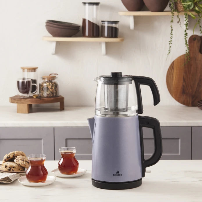 Théière en verre Karaca Tea, boîtier en acier inoxydable d'une puissance de 1650 watts, théière en verre et en même temps grâce à son utilisation comme bouilloire, vous pourrez préparer votre thé chaud avec plaisir.