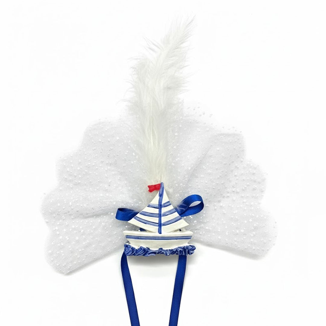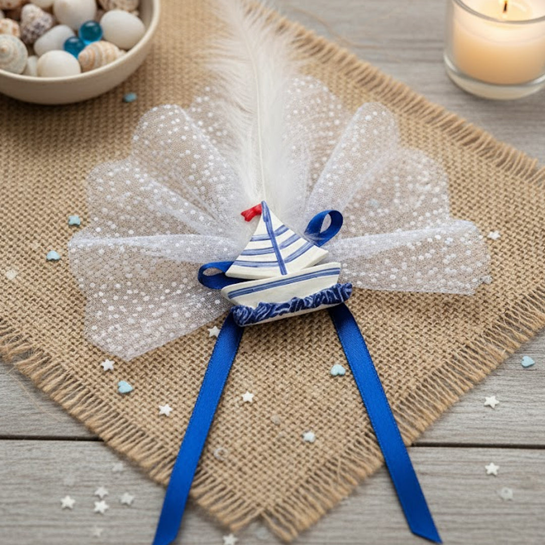 Das Boot ist mit weißer Tüllschleife, blauer Satinbandverzierung und einer weissen Feder geschmückt, was ihm einen maritimen und zugleich festlichen Charme verleiht.Ideal als Gastgeschenk für Sünnetfeiern, Baby-Partys, Geburtstage oder maritime Themenfeste.