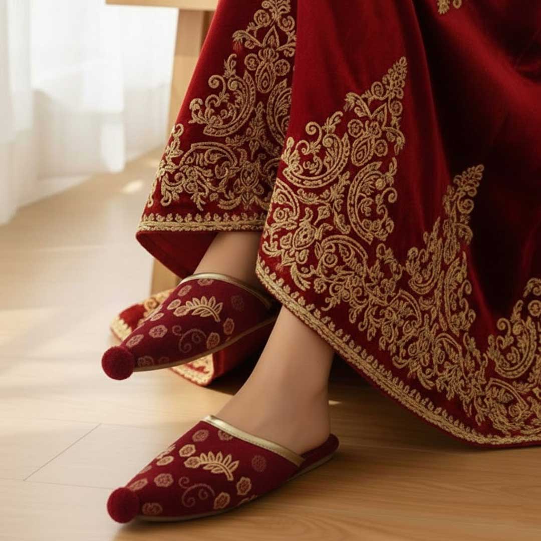 Gefertigt aus weichem, rotem Samt mit goldenen Stickereien und einem dekorativen Pompon an der Spitze – sie vereinen Komfort und orientalische Eleganz. Ideal als stilvolles Accessoire für Bräute oder Gäste bei besonderen Anlässen.
