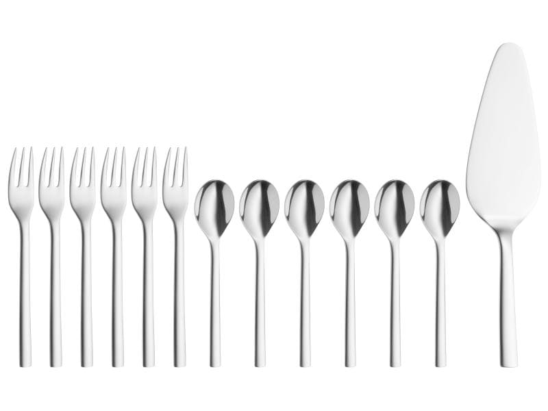 Spezialbestecke der Kollektion Nuova von WMF ergänzen die Besteckschublade in jeder Küche und sind immer dann die perfekte Lösung, wenn übliche Besteckteile an Grenzen des Komforts und des Handlings stossen, oder Spezialisten einfach noch besser geeignet sind. Das 13-teilige Nuova Kuchenbesteck-Set begeistert mit hoher Funktionalität in zeitlos-schlichtem Design. Das Set aus spülmaschinenfestem Cromargan enthält 6 Kuchengabeln, 6 Kaffeelöffel und 1 Tortenheber.