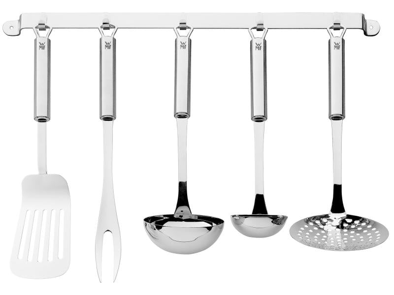 Das 6-teilige Profil Plus Schaumlöffel-Set von WMF besteht aus praktischen Küchenhelfern zum Stärke oder Fett abzuschöpfen, Gemüse, Gnocchi aus kochendem Wasser zu holen, Flüssigkeiten abtropfen zu lassen, Fleisch zu wenden und den Braten aus dem Topf zu nehmen. Dafür gibt es einen Schaumlöffel, eine grosse und kleine Kelle, eine Fleischgabel und einen Pfannenwender an einer Leiste, die sich bequem in der Küche montieren lässt. Das Handwerkszeug für die Küche ist aus Cromargan Edelstahl gefertigt, unverwüstlich, hygienisch, formstabil, säurefest und spülmaschinengeeignet. Die Funktionsteile sind fest in den Griffen mit Aufhängeöse einzementiert.