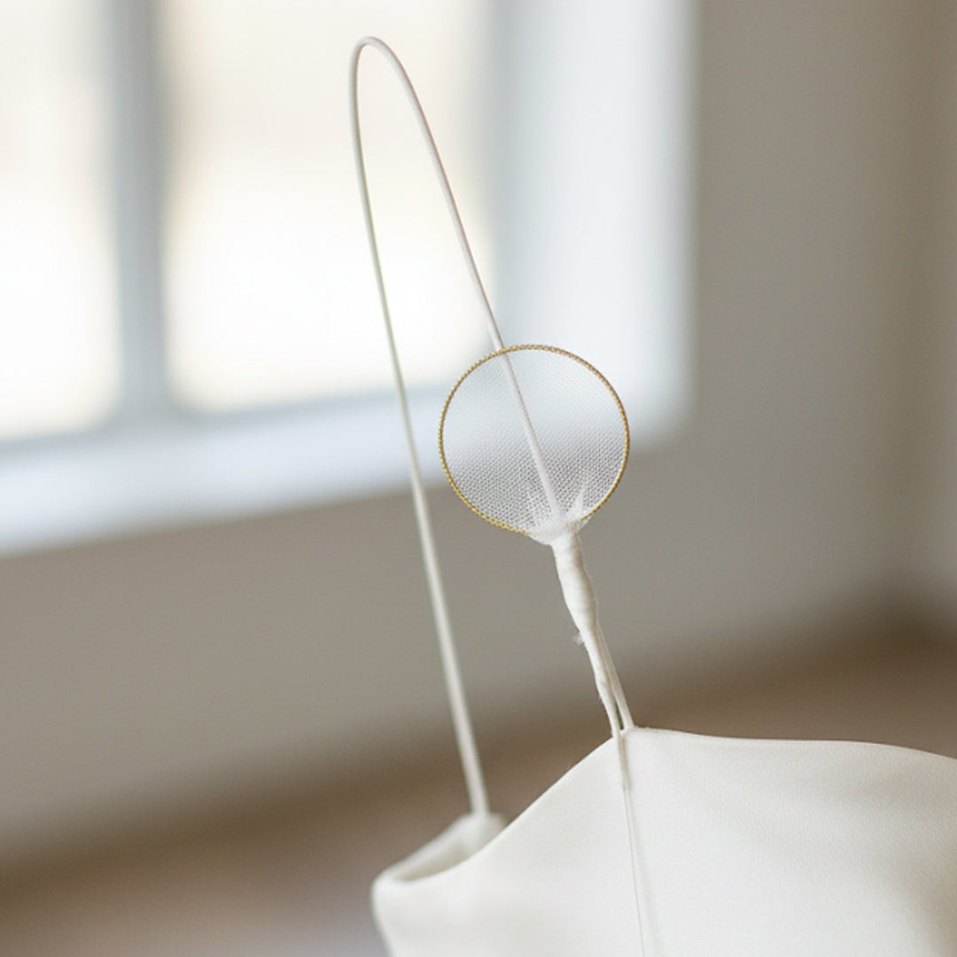 • Zart und filigran: Der runde Abschluss besteht aus feinem, weißen Tüll, der von einem dünnen, goldenen Metallrahmen eingefasst wird.