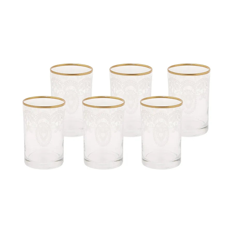 Verleihen Sie Ihrer Kaffeetafel mit dem 6-teiligen Beril Set aus edlen Kaffee- und Wassergläsern einen Hauch von Luxus. Diese Gläser sind mit einem stilvollen Goldrand verziert, der ihnen eine elegante und edle Ausstrahlung verleiht. Ideal für Kaffee, Tee oder erfrischende Getränke, bieten die Gläser ein komfortables Fassungsvermögen, das sowohl funktional als auch ästhetisch ansprechend ist. Hergestellt aus hochwertigem Glas, sind sie robust und pflegeleicht, sodass sie sowohl im Alltag als auch bei besonderen Anlässen überzeugen.