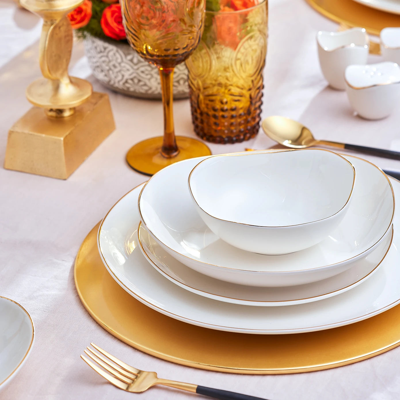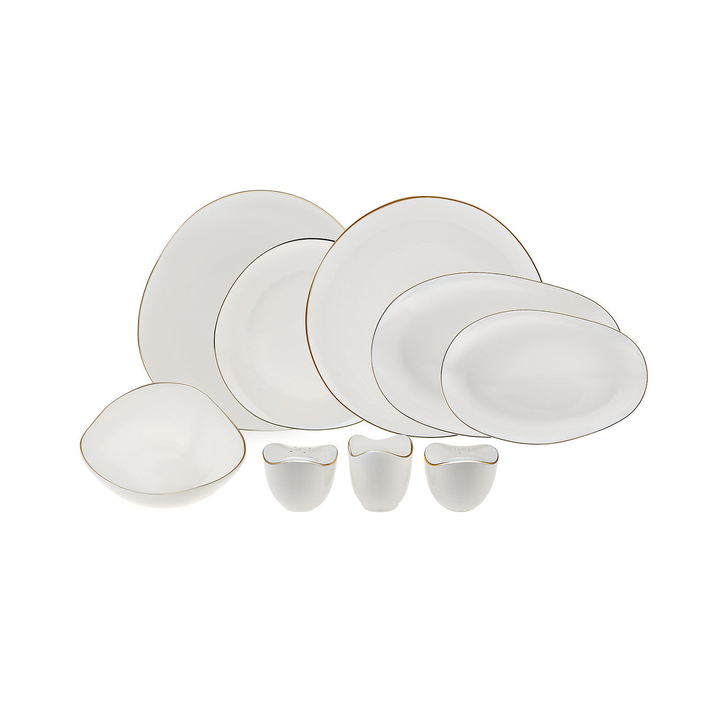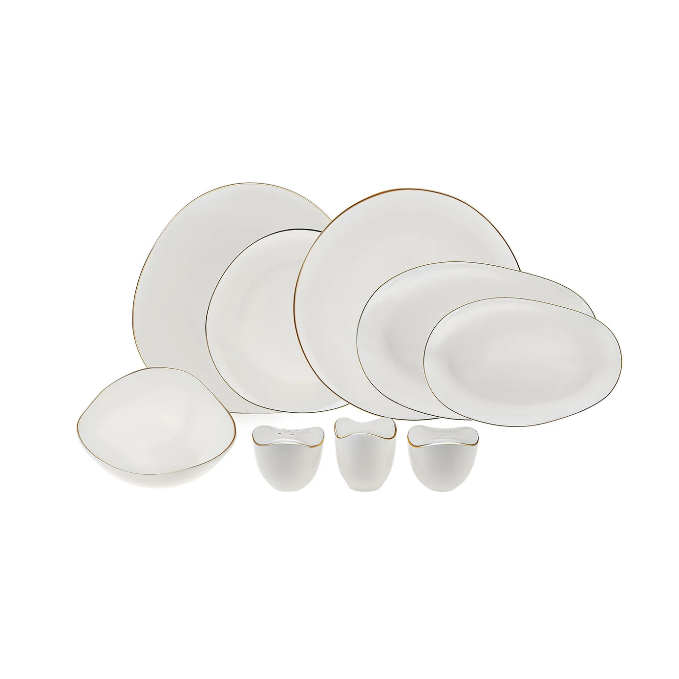 Das Karaca Red Carpet Collection Middle Streamline Geschirrset, 56-teilig, besticht durch sein elegantes Design und hochwertige Verarbeitung. Es umfasst alles, was Sie für eine stilvolle Tafel für 12 Personen benötigen. Gefertigt aus robustem Porzellan, zeichnet sich dieses Set durch seine Langlebigkeit und zeitlose Ästhetik aus. Die goldfarbenen Akzente verleihen Ihrer Tischdekoration einen Hauch von Luxus und machen jede Mahlzeit zu einem besonderen Erlebnis. Dieses vielseitige Set ist sowohl für festliche Anlässe als auch für den täglichen Gebrauch geeignet und lässt sich problemlos mit verschiedenen Besteck- und Glasstilen kombinieren. Bitte beachten Sie, dass Handwäsche empfohlen wird, um die Qualität und den Glanz der goldenen Details zu erhalten.