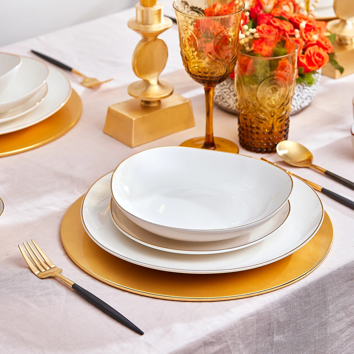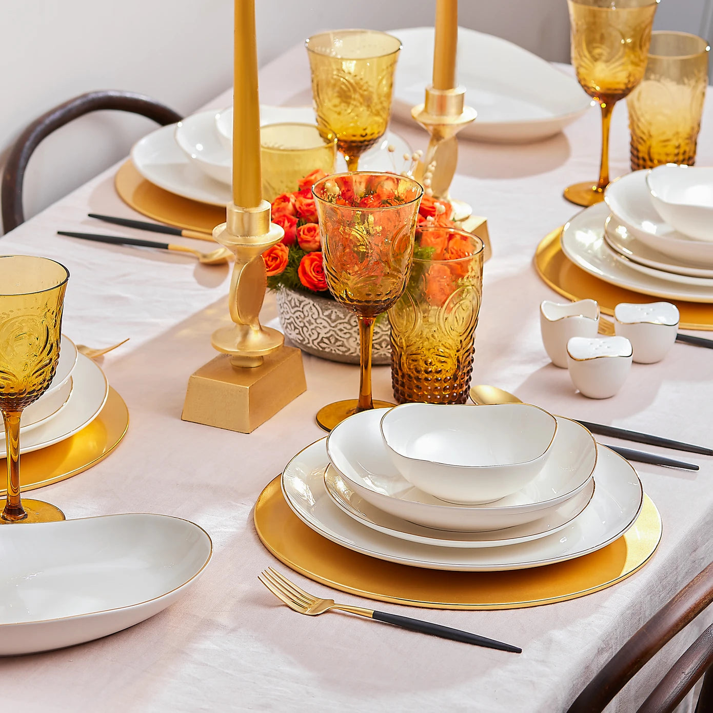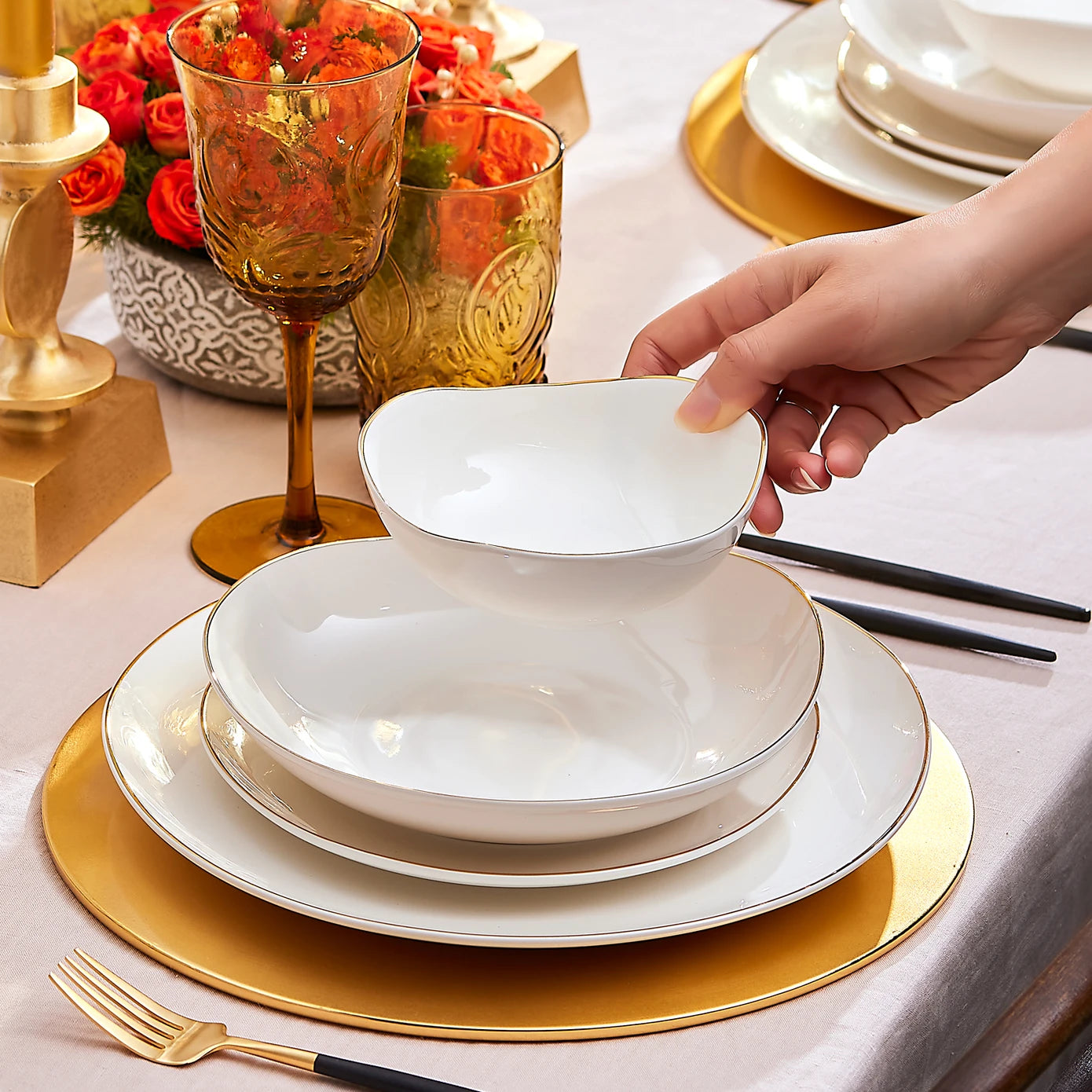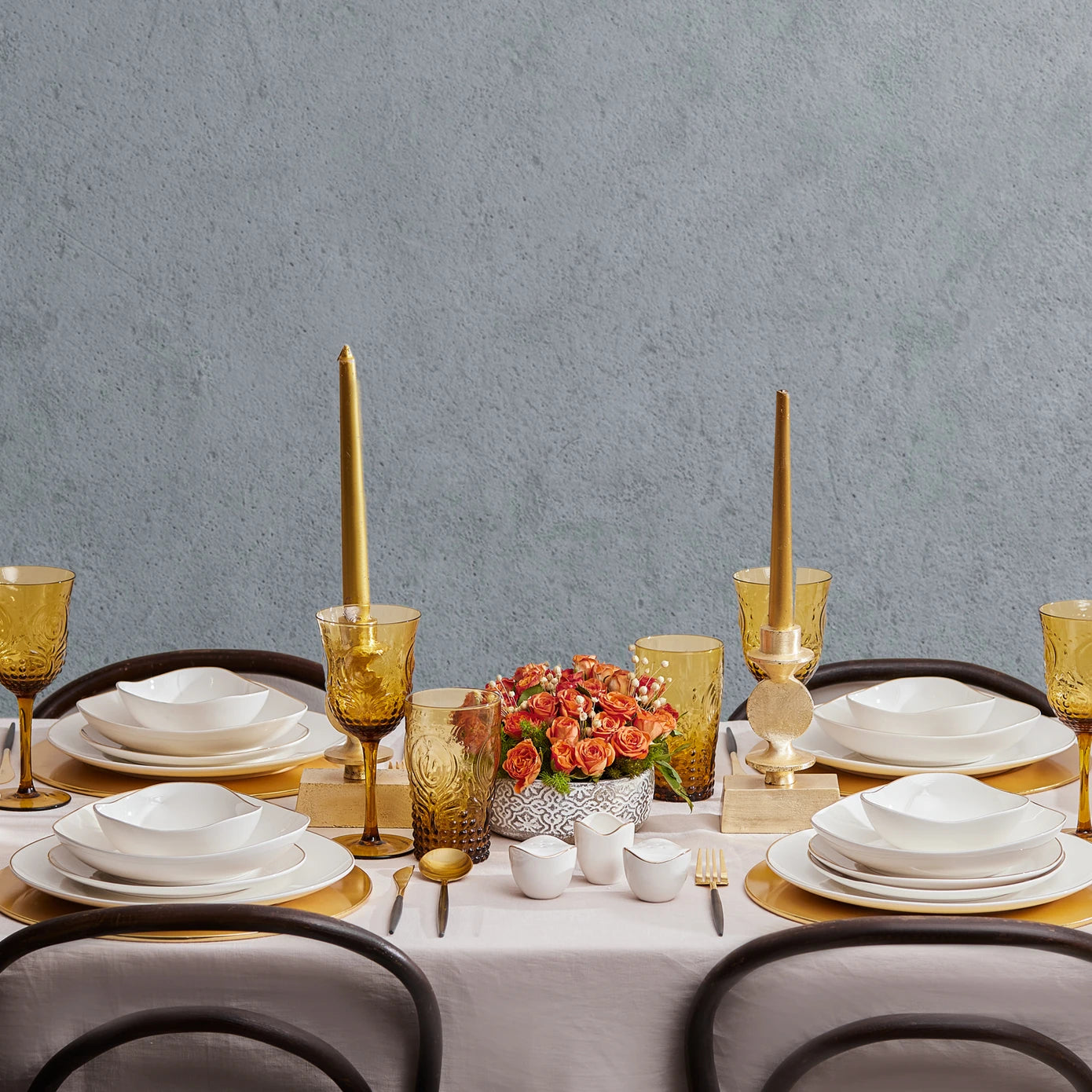 Das Karaca Red Carpet Collection Middle Streamline Geschirrset, 56-teilig, besticht durch sein elegantes Design und hochwertige Verarbeitung. Es umfasst alles, was Sie für eine stilvolle Tafel für 12 Personen benötigen. Gefertigt aus robustem Porzellan, zeichnet sich dieses Set durch seine Langlebigkeit und zeitlose Ästhetik aus. Die goldfarbenen Akzente verleihen Ihrer Tischdekoration einen Hauch von Luxus und machen jede Mahlzeit zu einem besonderen Erlebnis. Dieses vielseitige Set ist sowohl für festliche Anlässe als auch für den täglichen Gebrauch geeignet und lässt sich problemlos mit verschiedenen Besteck- und Glasstilen kombinieren. Bitte beachten Sie, dass Handwäsche empfohlen wird, um die Qualität und den Glanz der goldenen Details zu erhalten.