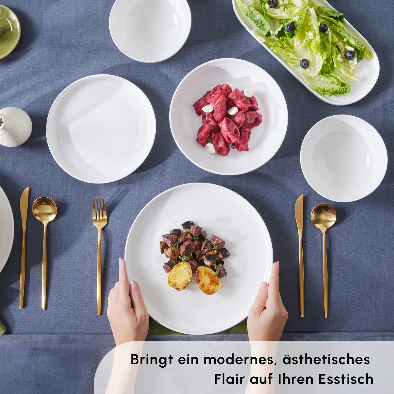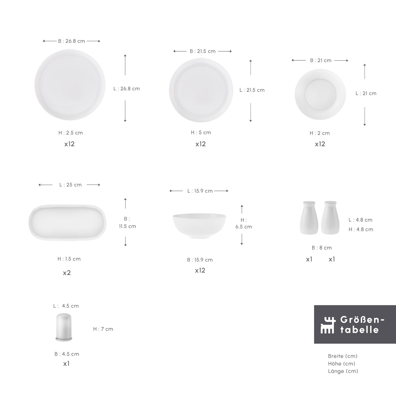Das Set bietet alles, was Sie für eine vollständig gedeckte Tafel benötigen – von Servier- und Pastatellern bis hin zu Bowls und praktischen Streuern. Egal ob tägliche Mahlzeiten oder besondere Einladungen: Dieses Set sorgt stets für einen stilvollen Auftritt.