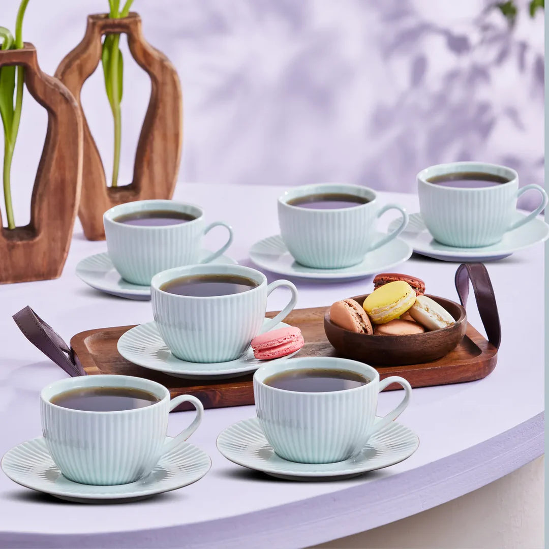 Das Seashell Zephyt Teetassenset für 6 Personen überzeugt mit seinem stilvollen, maritimen Design in elegantem Blau. Die geschwungenen Linien und das hochwertige Material machen jede Teestunde zu einem besonderen Erlebnis. Mit einem Fassungsvermögen von 200ml sind die Tassen perfekt für Tee, Kaffee oder andere Heißgetränke geeignet. Ein Must-have für stilbewusste Genießer und ein perfektes Geschenk für Teeliebhaber.