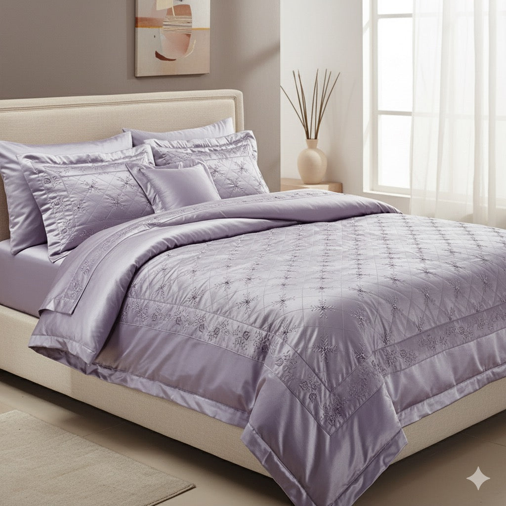 Verleihen Sie Ihrem Schlafzimmer einen Hauch von Luxus mit der Diva Tagesdecke in edlen Lilatönen! Mit ihren eleganten, handgefertigten Stickereien und dem hochwertigen Jacquardstoff wird sie zum stilvollen Mittelpunkt Ihres Schlafbereichs. Diese Tagesdecke schützt Ihr Bett vor Staub und äußeren Einflüssen und sorgt gleichzeitig für ein ordentliches und harmonisches Ambiente.