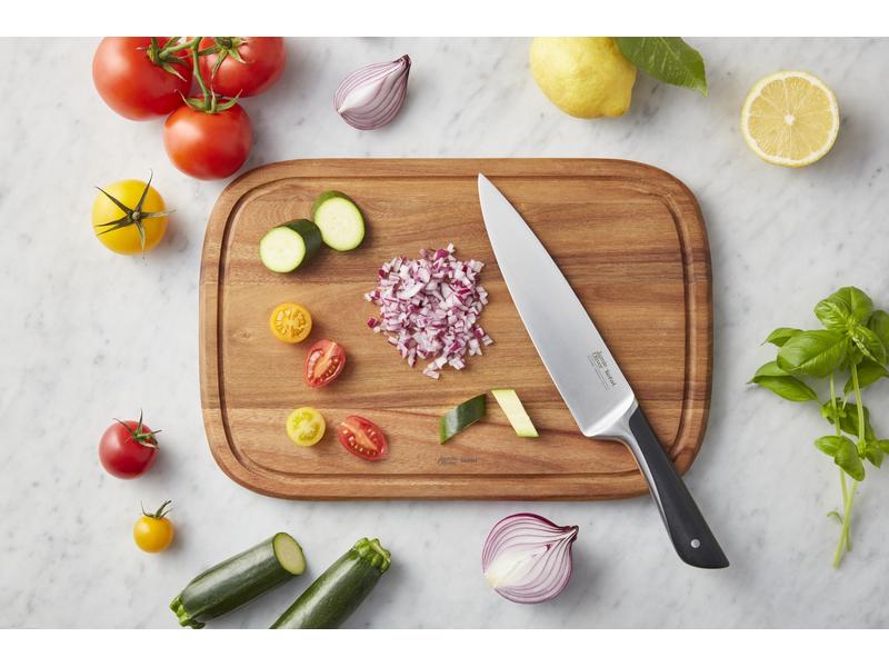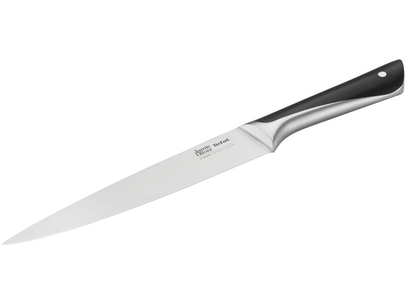 Jamie bringt Leidenschaft und Können mit; Tefal sorgt für Technologie und Leistung. Gemeinsam, stellen hochwertige und bewährte Produkte her. «Das Messer, das in Ihrer Küche nicht fehlen darf. Tranchieren Sie ein Brathähnchen oder zerteilen Sie einen ganzen gebackenen Blumenkohl mit perfekter Kontrolle.» Jamie Oliver