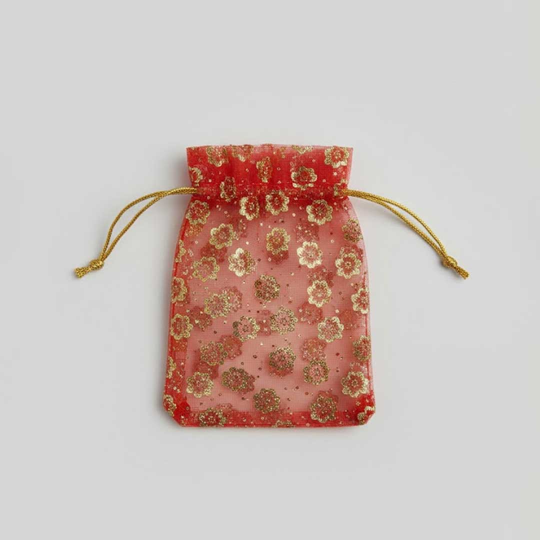 Jeder Beutel besteht aus transparentem rotem Organza-Stoff mit goldfarbenem Blumenmuster und praktischem Zugband.