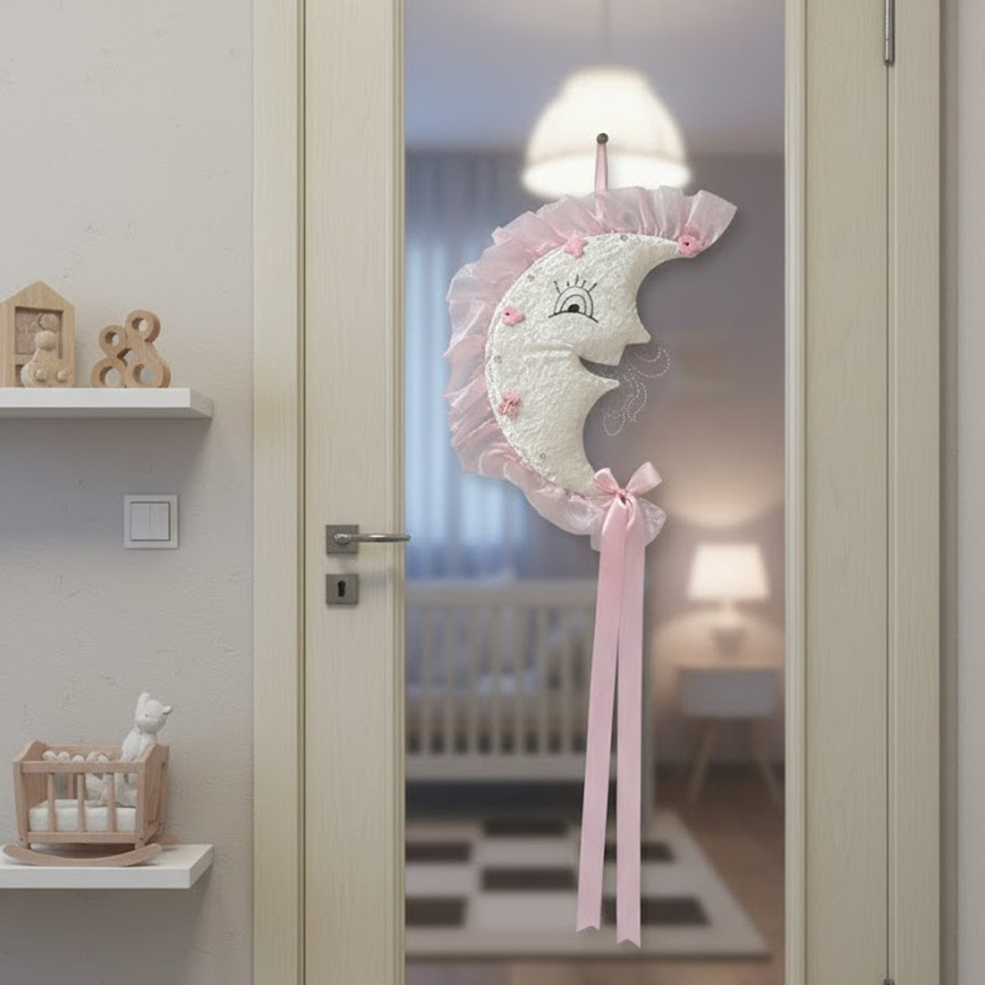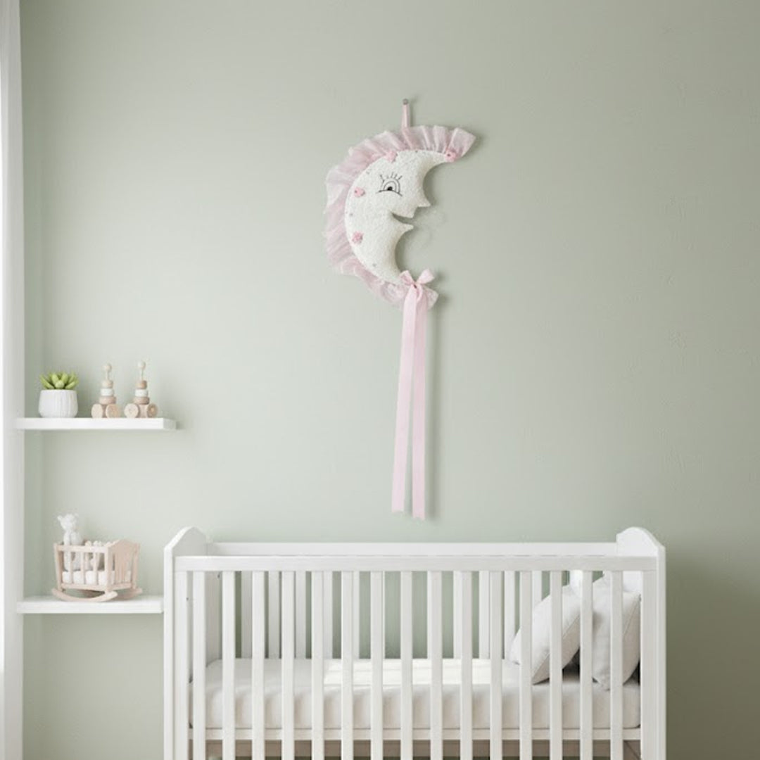 Diese liebevoll gestaltete Halbmond-Deko in zartem Rosa verleiht jedem Babyzimmer eine warme und beruhigende Atmosphäre.