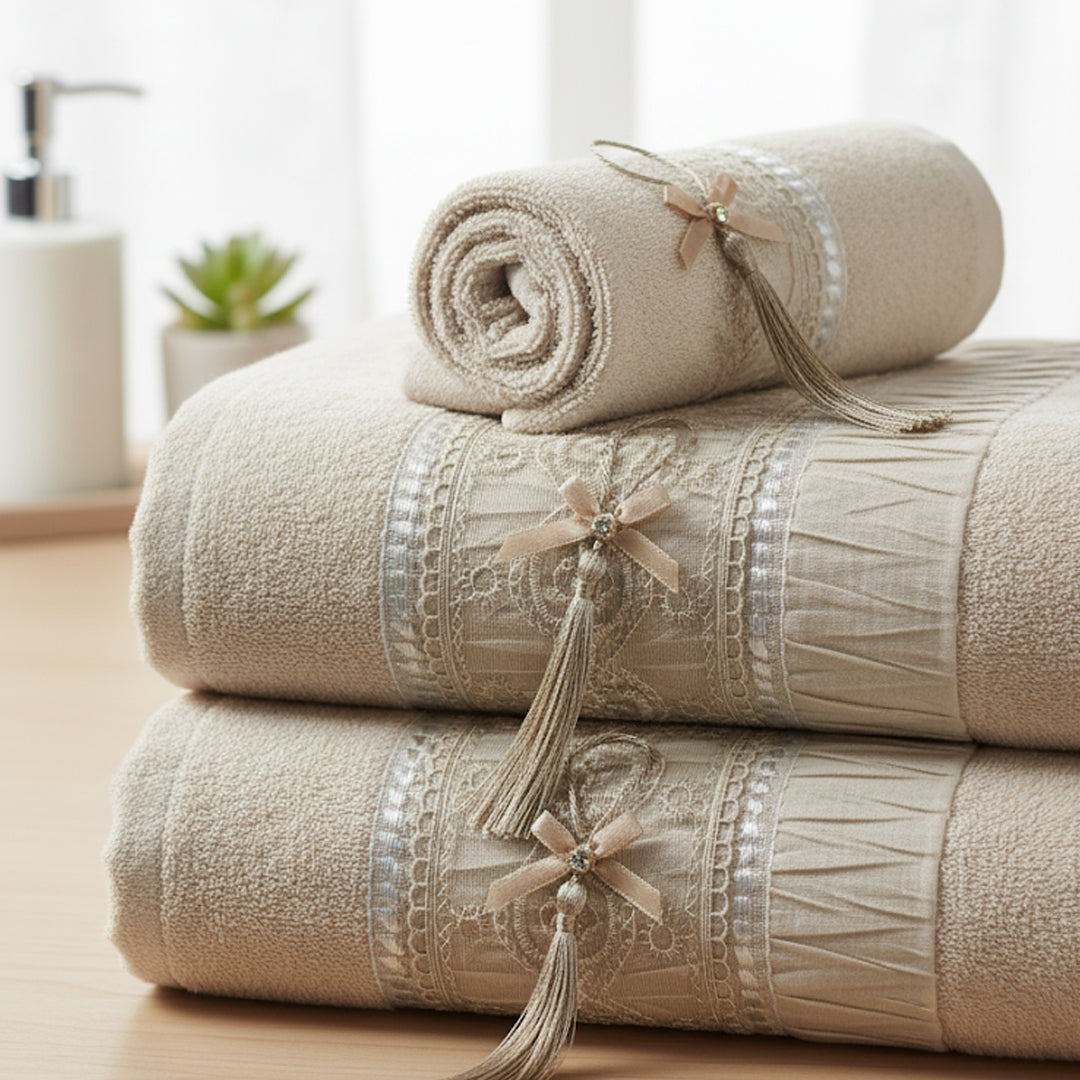 Dieses elegante Handtuch besteht aus 100% hochwertiger Baumwolle und ist mit einer feinen Spitzenbordüre sowie glänzenden Polyesterfäden verziert. Die dekorativen Quasten verleihen dem Handtuch einen edlen, handgefertigten Look. Dank der natürlichen Baumwolle ist es besonders weich, saugfähig und hautfreundlich – ideal für Gäste- oder Badezimmer.