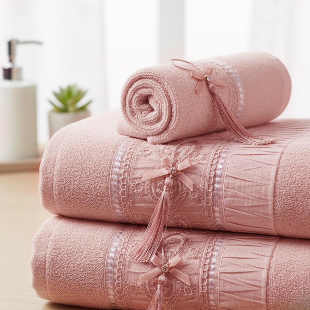 Dieses elegante Handtuch besteht aus 100% hochwertiger Baumwolle und ist mit einer feinen Spitzenbordüre sowie glänzenden Polyesterfäden verziert. Die dekorativen Quasten verleihen dem Handtuch einen edlen, handgefertigten Look. Dank der natürlichen Baumwolle ist es besonders weich, saugfähig und hautfreundlich – ideal für Gäste- oder Badezimmer.