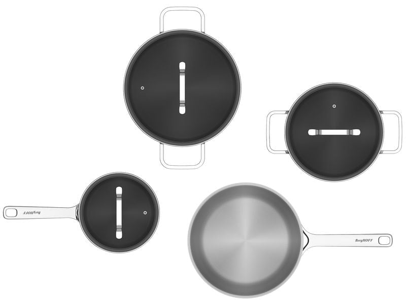Das 7-teilige Kochgeschirrset HELIX von BergHOFF besteht aus recyceltem Edelstahl und verfügt über einen gekapselten Boden, der die Wärme schnell und gleichmässig leitet. Die Töpfe und Pfannen sind bis zu 250 °C ofenfest, kratzfest und für alle Herdarten geeignet, einschliesslich Induktion. Der stilvolle Glasdeckel in Schwarz hat ein integriertes Entlüftungsloch für eine einfache Handhabung während des Kochens.