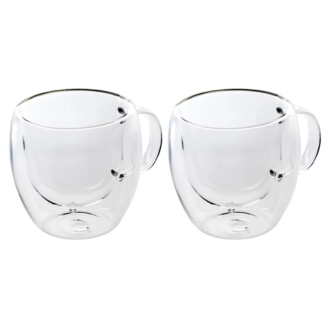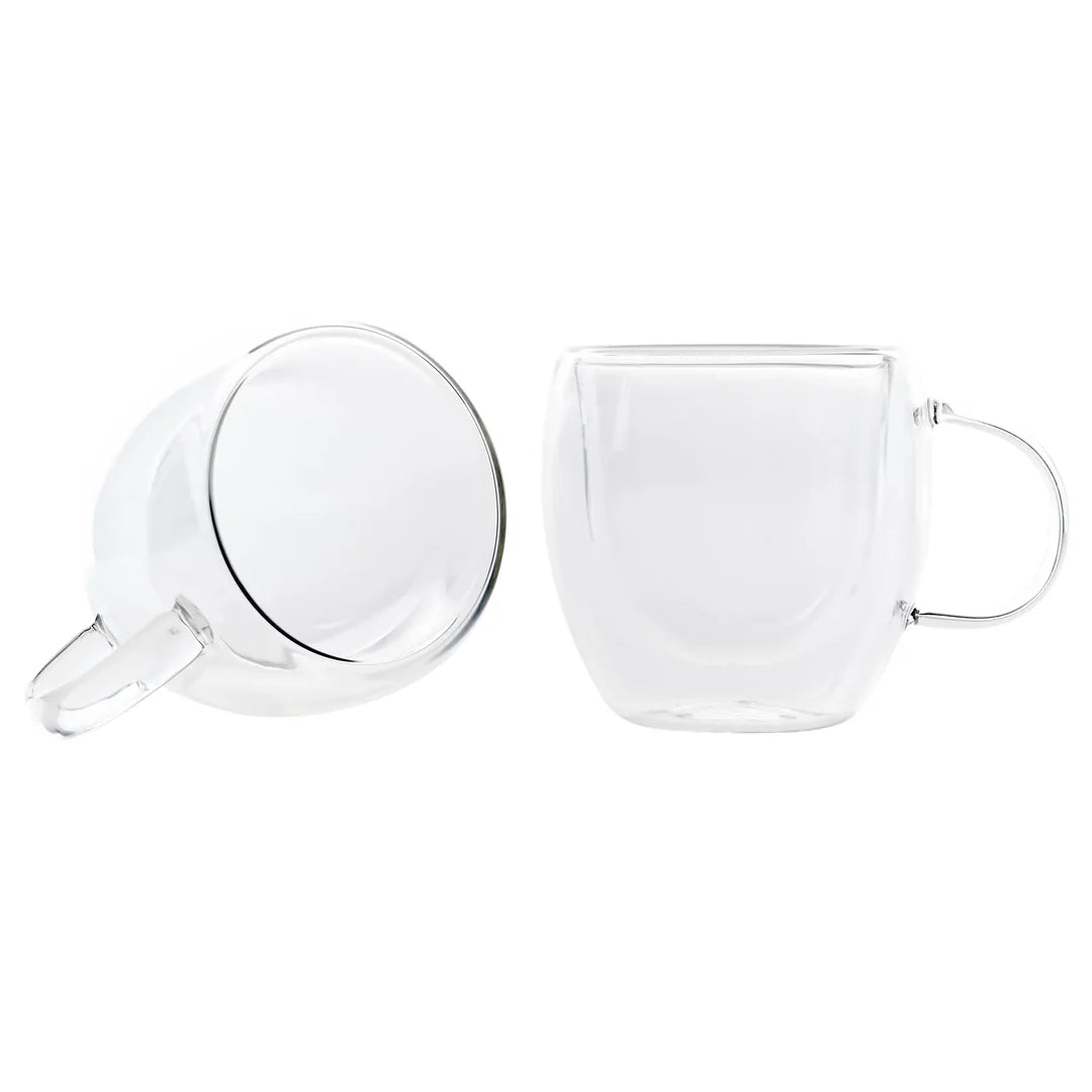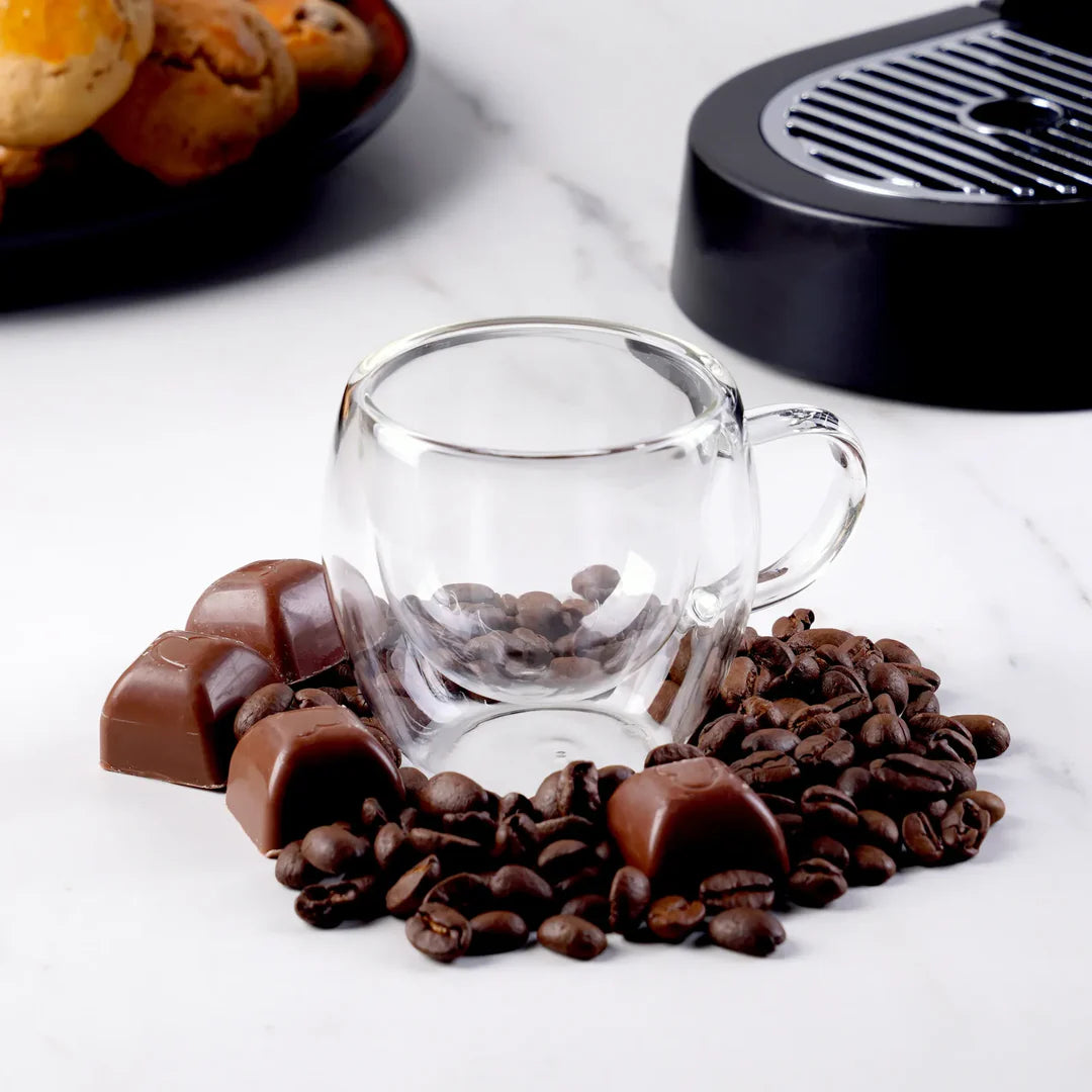 Das Double Wall Borosilikat Glas Tassenset vereint modernes Design mit funktionaler Eleganz. Die doppelwandige Konstruktion sorgt für eine optimale Isolierung und hält Heißgetränke länger warm, während die Außenseite angenehm kühl bleibt. Mit einem Fassungsvermögen von 150 ml ist dieses Set ideal für Espresso, Tee oder kleine Kaffeespezialitäten. Das hochwertige Borosilikatglas ist hitzebeständig, leicht und besonders robust. Die ergonomischen Henkel bieten einen bequemen Griff, während die transparente Optik für einen stilvollen Genussmoment sorgt. Perfekt für den Alltag oder besondere Kaffeegenuss-Momente zu zweit.
