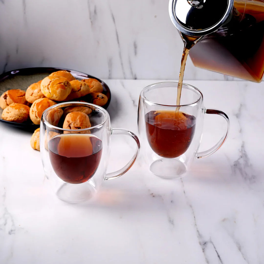 Genießen Sie Ihren Kaffee oder Tee stilvoll mit dem Double Wall Borosilikat Glas Tassenset. Die doppelwandige Isolierung hält Ihr Getränk länger heiß, während die Außenseite angenehm kühl bleibt. Mit einem großzügigen Fassungsvermögen von 300 ml eignet sich dieses Set perfekt für Kaffee, Tee oder andere Heißgetränke. Hergestellt aus hitzebeständigem und langlebigem Borosilikatglas, überzeugt es durch sein modernes, elegantes Design und hohe Funktionalität. Die ergonomische Form sorgt für einen komfortablen Griff, während die transparente Optik ein ansprechendes Trinkerlebnis bietet.