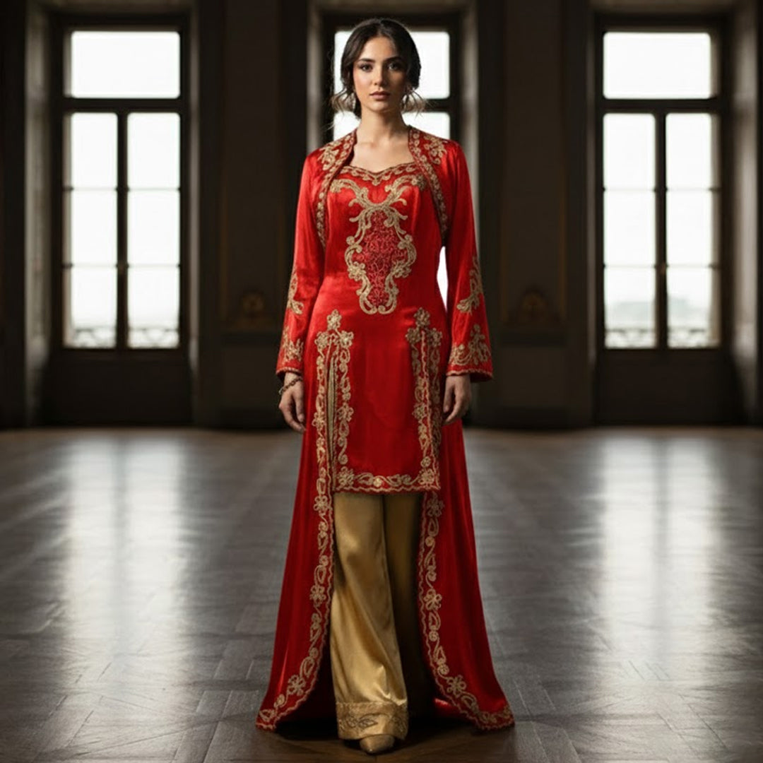 Die figurbetonte Passform des Oberteils und der lange, offen geschnittene Mantel verleihen dem Kleid eine königliche Ausstrahlung – perfekt für Kına-Abende, Verlobungsfeiern und traditionelle Hochzeiten.