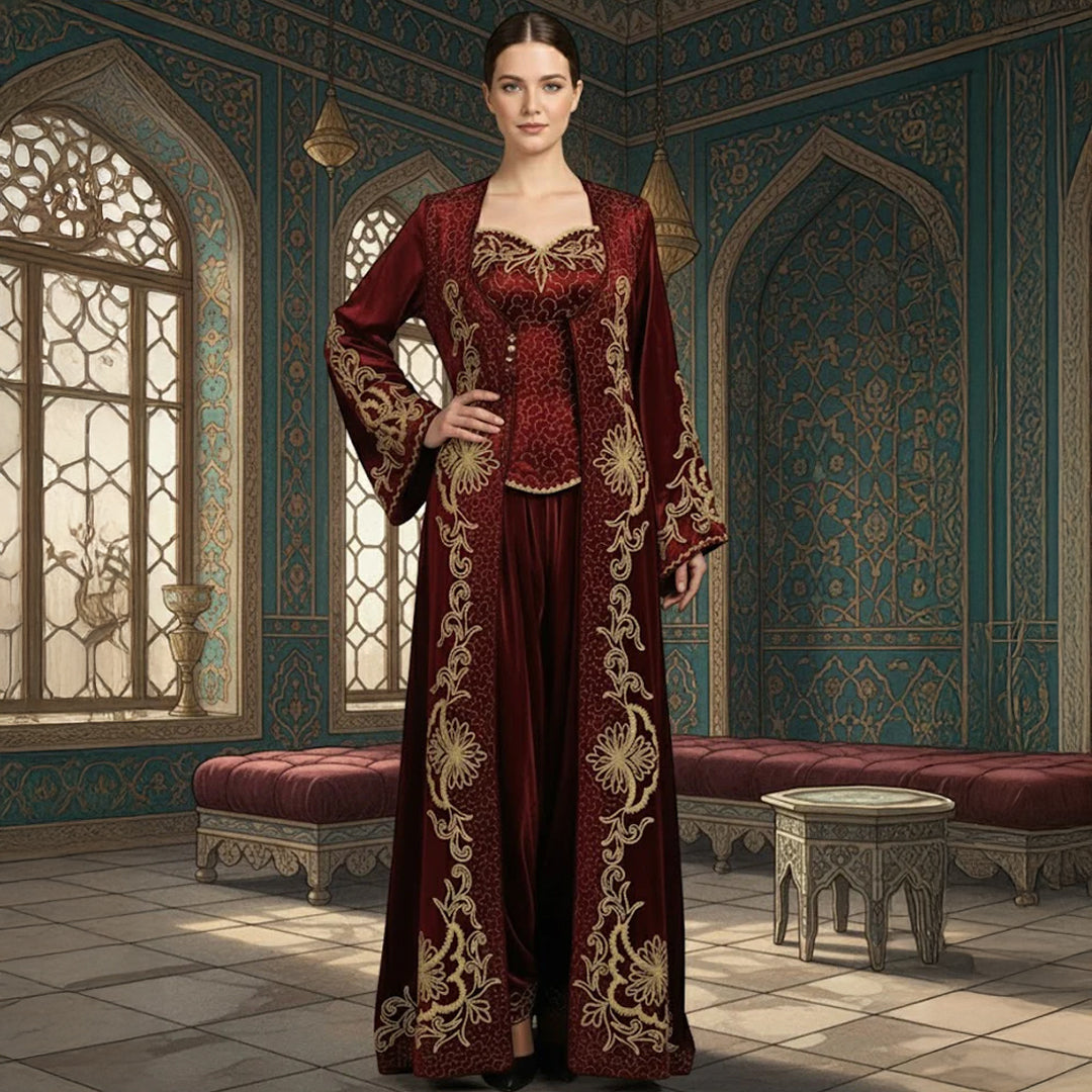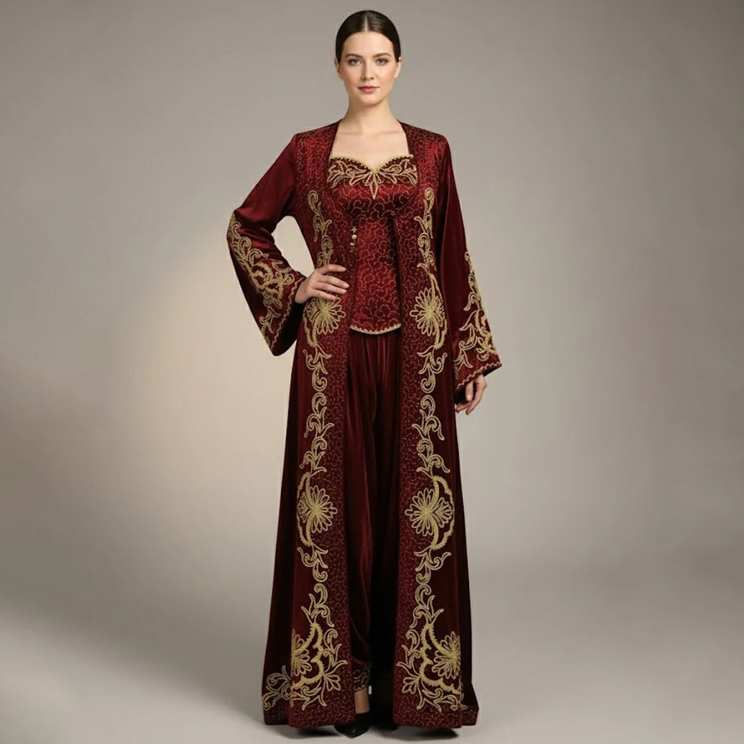 Das dreiteilige Set besteht aus einem langen bestickten Kaftan, einem passenden Bustier und einer weiten Hose – perfekt abgestimmt für einen stilvollen und komfortablen Auftritt.