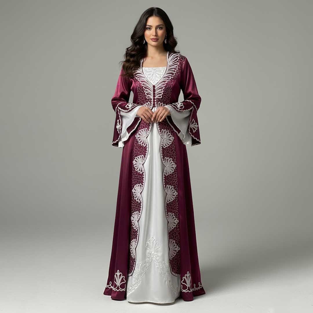 Die weiten Ärmel und die fließende Silhouette betonen die feminine Anmut und machen dieses Modell ideal für Kina-Abende, Verlobungsfeiern oder traditionelle Hochzeiten.