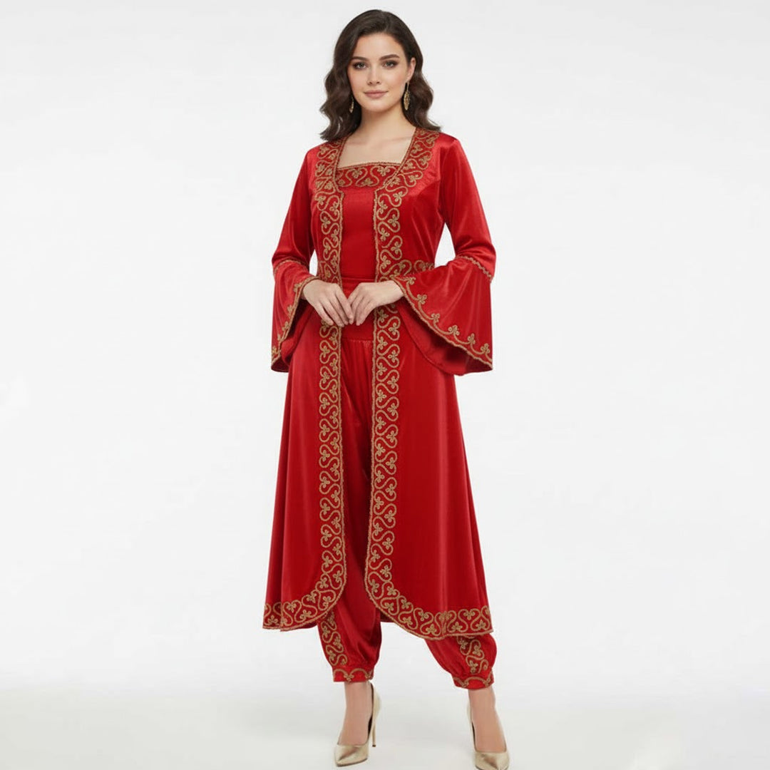 Das Outfit besteht aus einer langen, offen geschnittenen Jacke, einem passenden Oberteil und einer bequemen Şalvar-Hose.