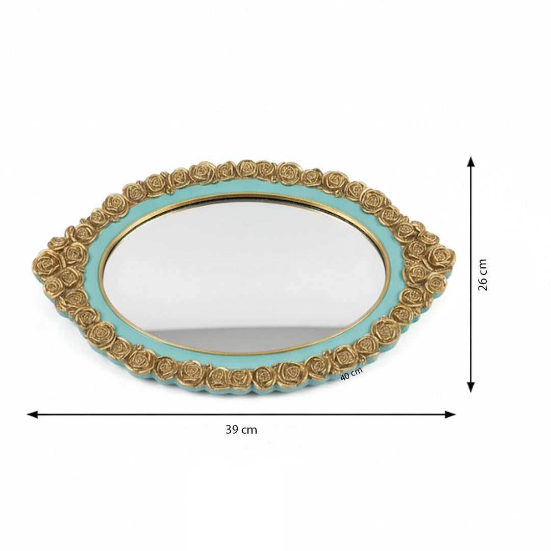Das ovale Tablett verfügt über einen Spiegelboden und einen kunstvoll verzierten goldfarbenen Rand. Die zarten türkisen Akzente verleihen dem Design einen edlen und modernen Look.