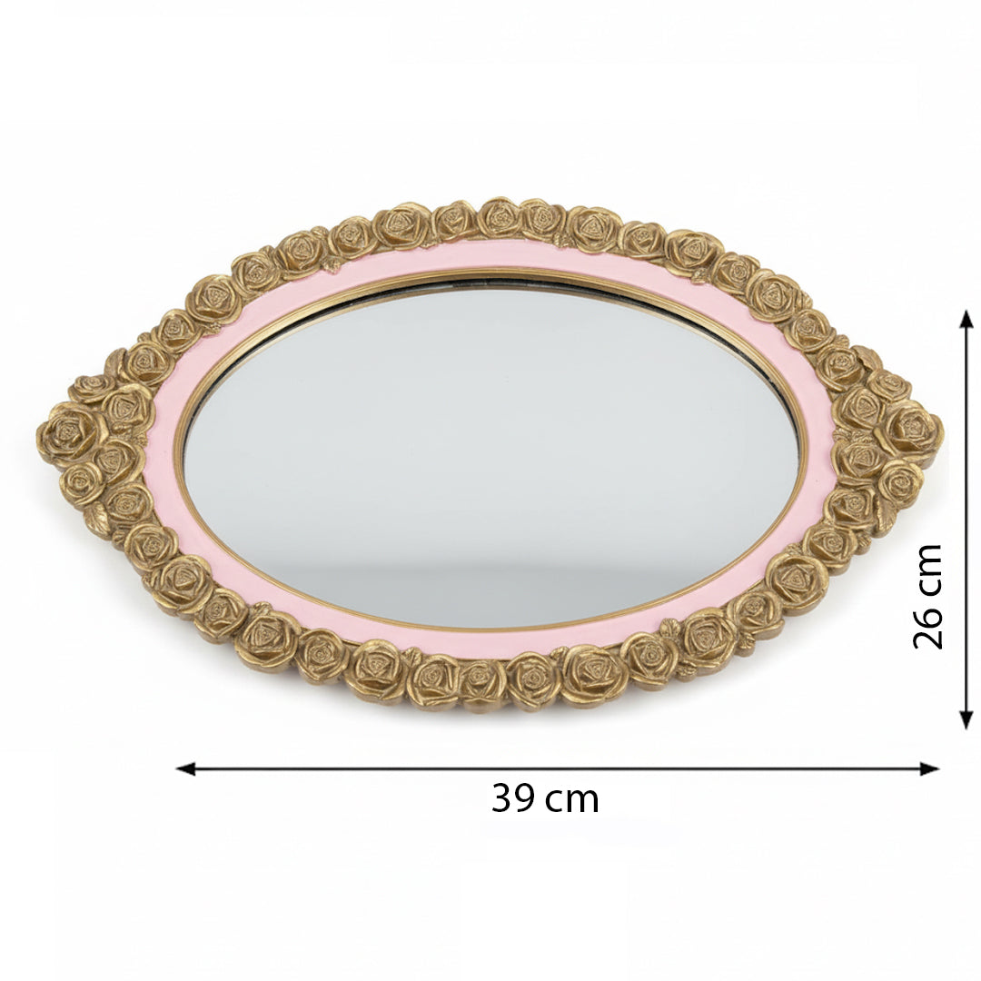 Das ovale Tablett verfügt über einen Spiegelboden und einen kunstvoll verzierten goldfarbenen Rand. Die zarten roséfarbenen Akzente verleihen dem Design einen romantischen, edlen und modernen Look.
