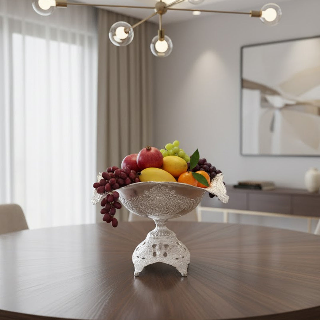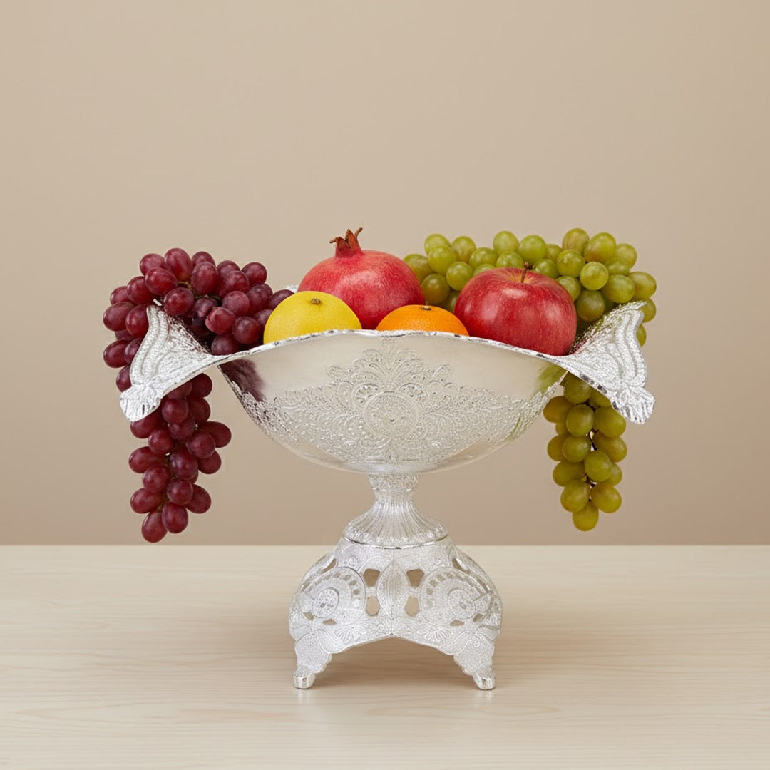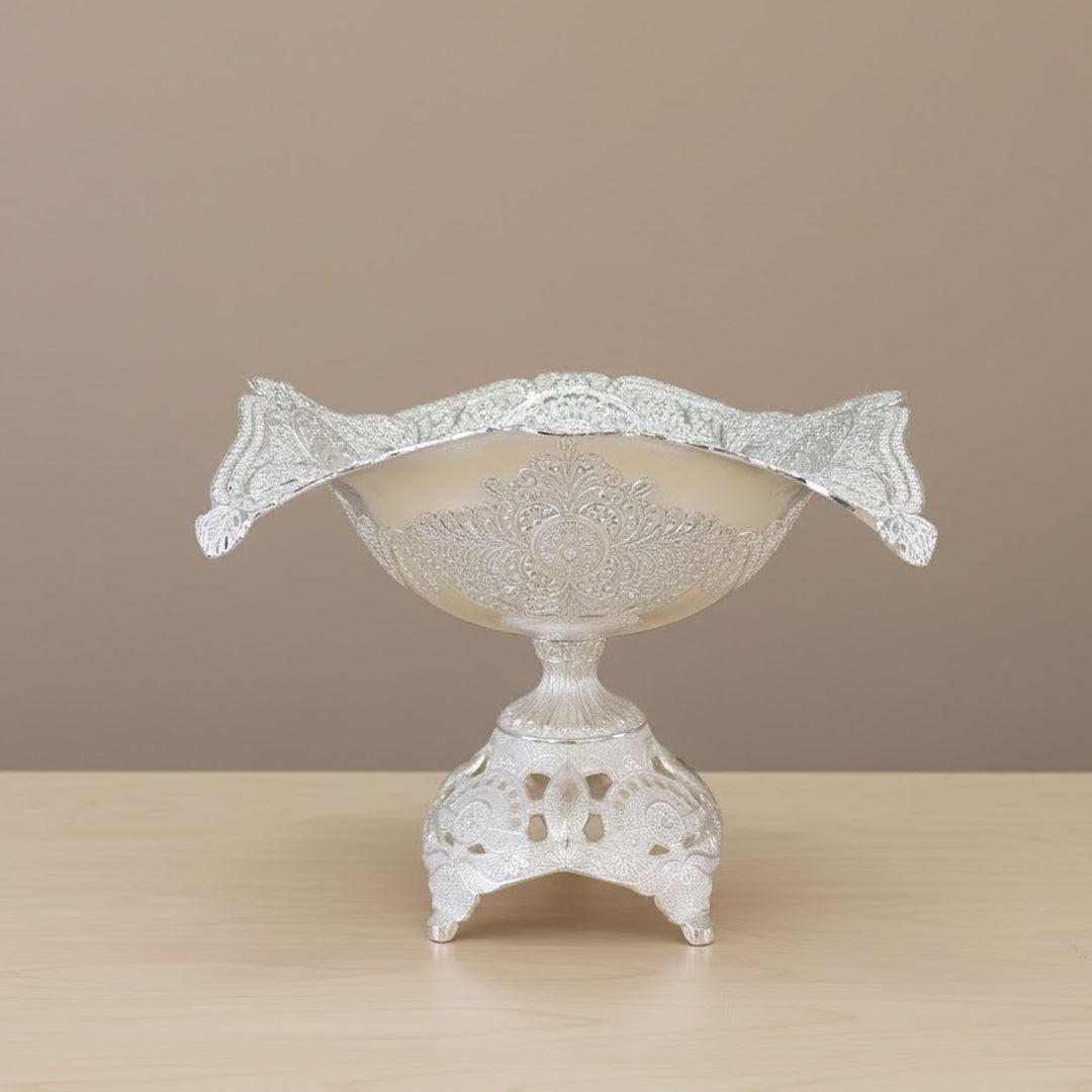 Die Grosse Fruchtschalen Gondel Mit Versilbertem Flikari-Fuss ist aus hochwertigem Material hergestellt, um eine haltbare und langlebige Struktur zu garantieren. Die große Fruchtschale ist durch eine versilberte Fligran-Gondel mit stabilem Fuss verbunden und bietet ein vollendetes Design und eine reichere Erfahrung.