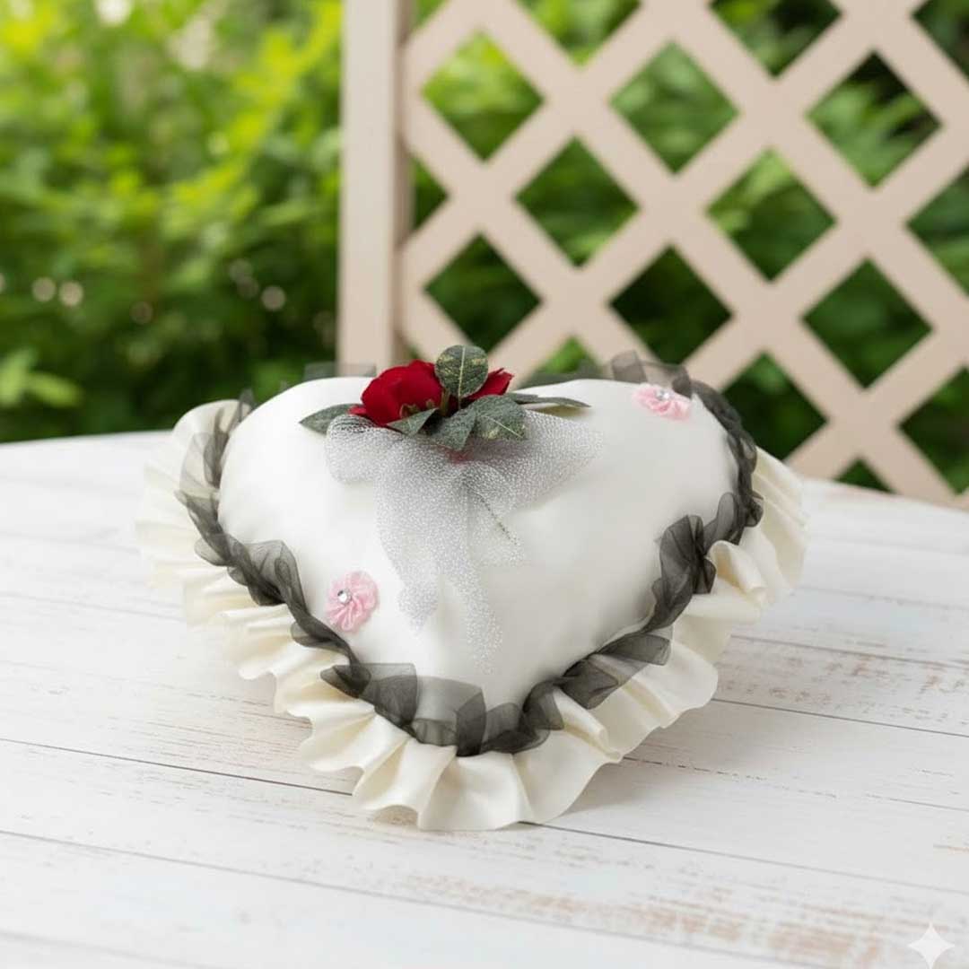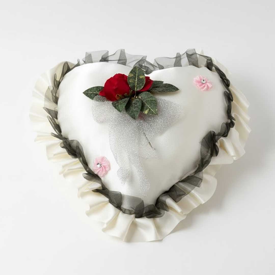 Mit einer edlen roten Rose, feinen Spitzenrüschen und einer dekorativen Schleife verziert, steht dieses Kissen für Romantik, Liebe und Stil.