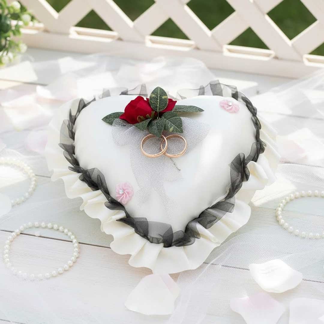 Die harmonische Kombination aus Weiß, Schwarz und Rot verleiht dem Design einen eleganten und modernen Touch – ideal, um Verlobungsringe stilvoll zu präsentieren oder als Tischdekoration zu verwenden.