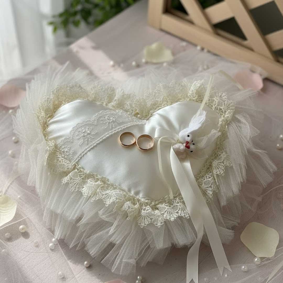 Ein romantisches, herzförmiges Verlobungskissen, das Eleganz und Liebe perfekt vereint. Das Kissen ist aus feinem Satin gefertigt und mit edler Spitze, zartem Tüll und einem dekorativen Taubenpaar geschmückt – ein wunderschönes Symbol für Liebe und Zusammenhalt.