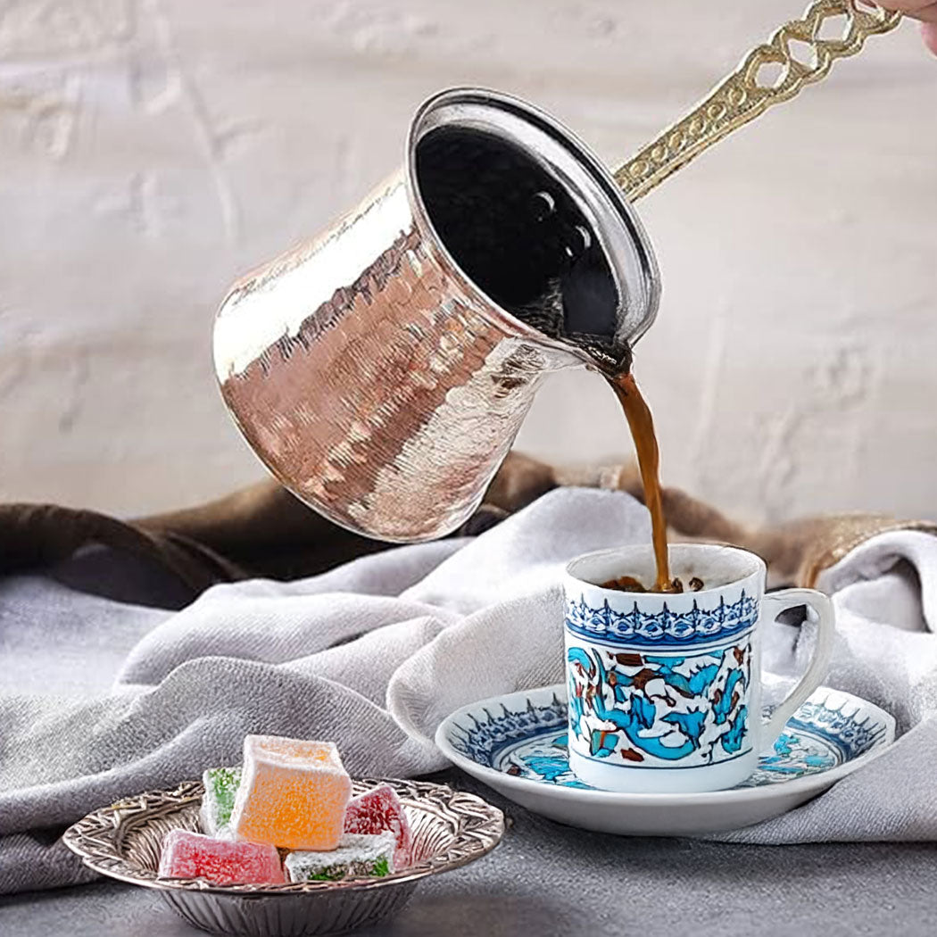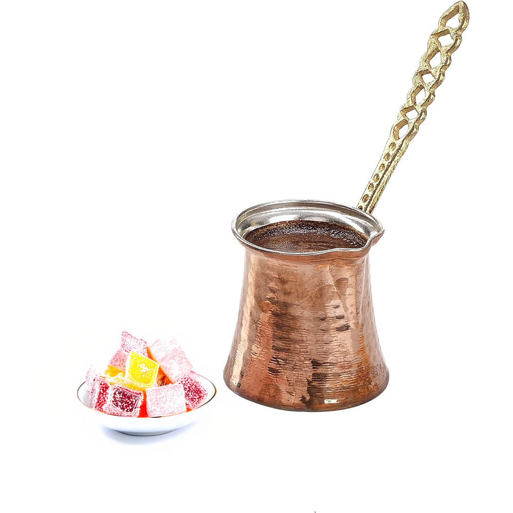 Erleben Sie authentischen Kaffeegenuss mit diesem, bestehend aus einer traditionellen türkischen Kaffeekanne (Cezve) und zwei passenden Schalen. Die Kaffeekanne aus hochwertigem Edelstahl mit gehämmertem Kupfer-Finish vereint klassische Ästhetik mit moderner Funktionalität. Der ergonomische Griff sorgt für eine sichere Handhabung, während das Design die Wärme gleichmässig verteilt, um den perfekten türkischen Kaffee zuzubereiten. Die beiden Schalen ergänzen das Set ideal und eignen sich hervorragend zum Servieren von Delikatessen oder Beilagen. Dieses Set ist nicht nur ein Blickfang in jeder Küche, sondern auch ein ideales Geschenk für Kaffeeliebhaber und Freunde orientalischer Kultur.