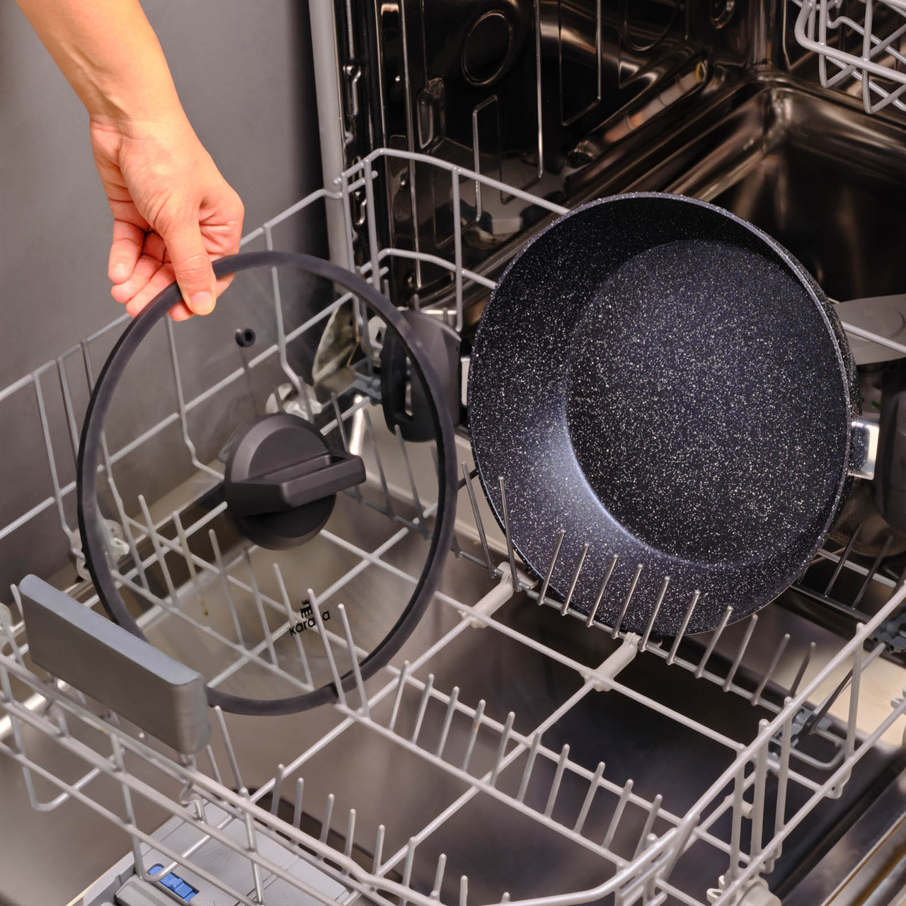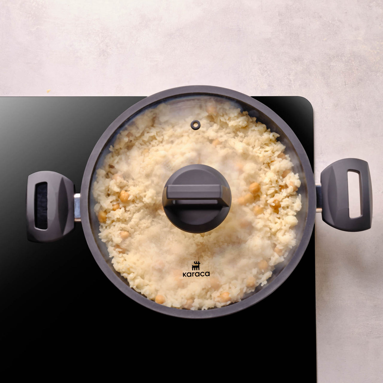 Dank der gleichmäßigen Wärmeverteilung der Aqua-Serie wird jedes Gericht gleichmäßig gegart, während der ergonomische Griff sicheren Halt bietet.