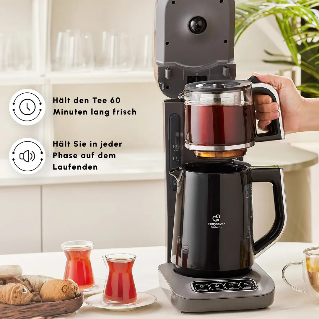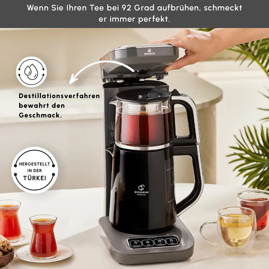 Der Karaca Çaysever Robotea Pro ist ein vielseitiger 4-in-1-Automat, der als Teekocher, Wasserkocher und Filterkaffeemaschine dient. Mit einer Leistung von 2500W und einer stilvollen Space-Grau-Farbgebung bietet dieses Gerät sowohl Funktionalität als auch modernes Design. Dank der automatischen Teebrühfunktion ist Ihr Tee in nur 15 Minuten fertig und bleibt bis zu 60 Minuten warm. Die Warmhaltefunktion sorgt dafür, dass Ihre Getränke stets die ideale Temperatur haben. Zusätzlich verfügt der Robotea Pro über verschiedene Heizstufen, die es ermöglichen, Babynahrung bei 40°C zuzubereiten oder köstlichen Tee bei 100°C zu genießen. Eine besondere Eigenschaft ist die Sprachfunktion, die Sie während des Brühvorgangs informiert.