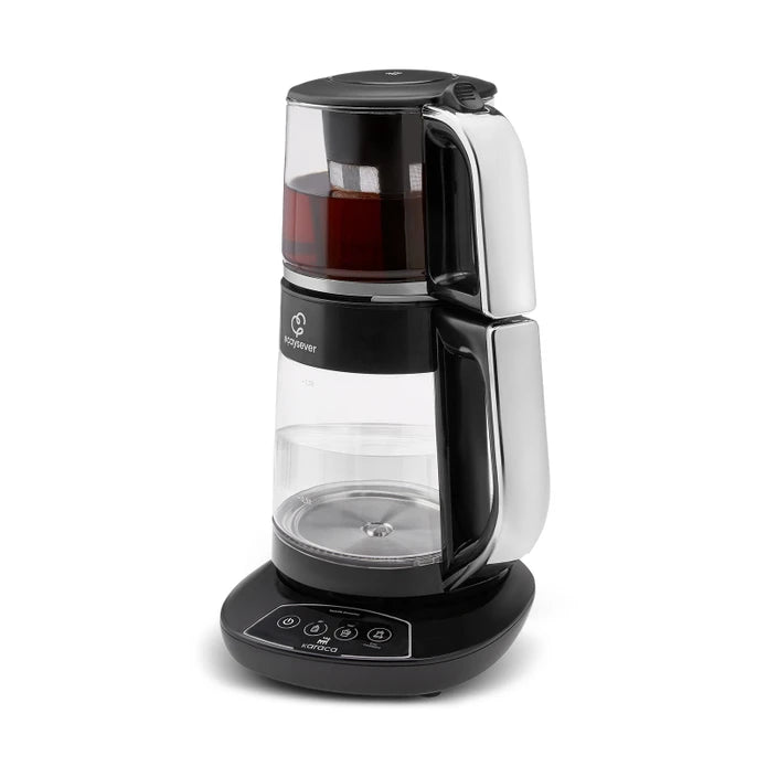 Mit unserem Karaca Çaysever Sprechende Teepot und Wasserkocher 1700W Chrome zieht in Ihre Küche ein praktisches Haushaltsgerät ein, das Tradition und moderne Funktion vereint. Die ursprüngliche Variante des Wasserkochers wurde um die nützliche Sprachfunktion sowie eine Teekanne erweitert. Somit entscheiden Sie sich mit diesem Teekocher für eine der beliebtesten Neuheiten für den Haushalt. In nur 15 Minuten brühen Sie den perfekten Tee auf. Die Teemaschine informiert Sie per Sprachfunktion, wann das heiße Wasser optimal aromatisiert ist. Dank der integrierten Warmhaltefunktion wird der frisch aufgebrühte Früchtetee oder Kräutertee warm gehalten. Eine Warnleuchte signalisiert nach 40 Minuten, wenn der Tee in der Kanne abgestanden ist. Da der Wasserkocher BPA-frei ist, eignet er sich selbstverständlich auch für die Zubereitung von heißem Wasser für die Babynahrung.