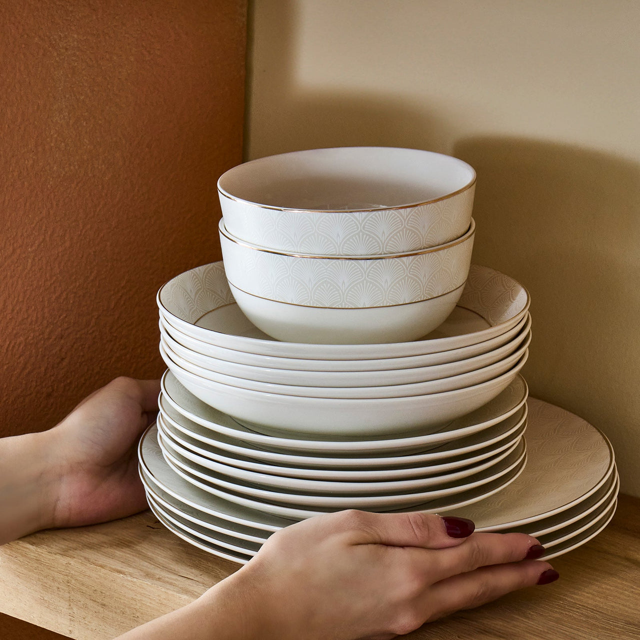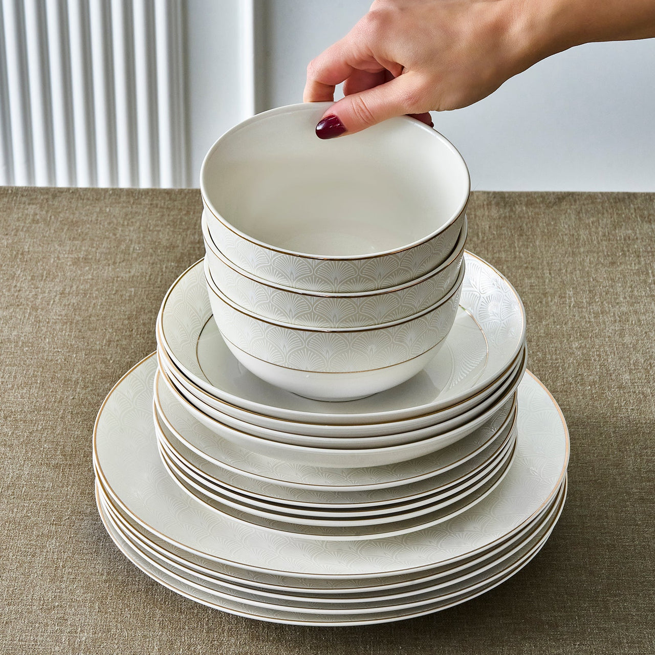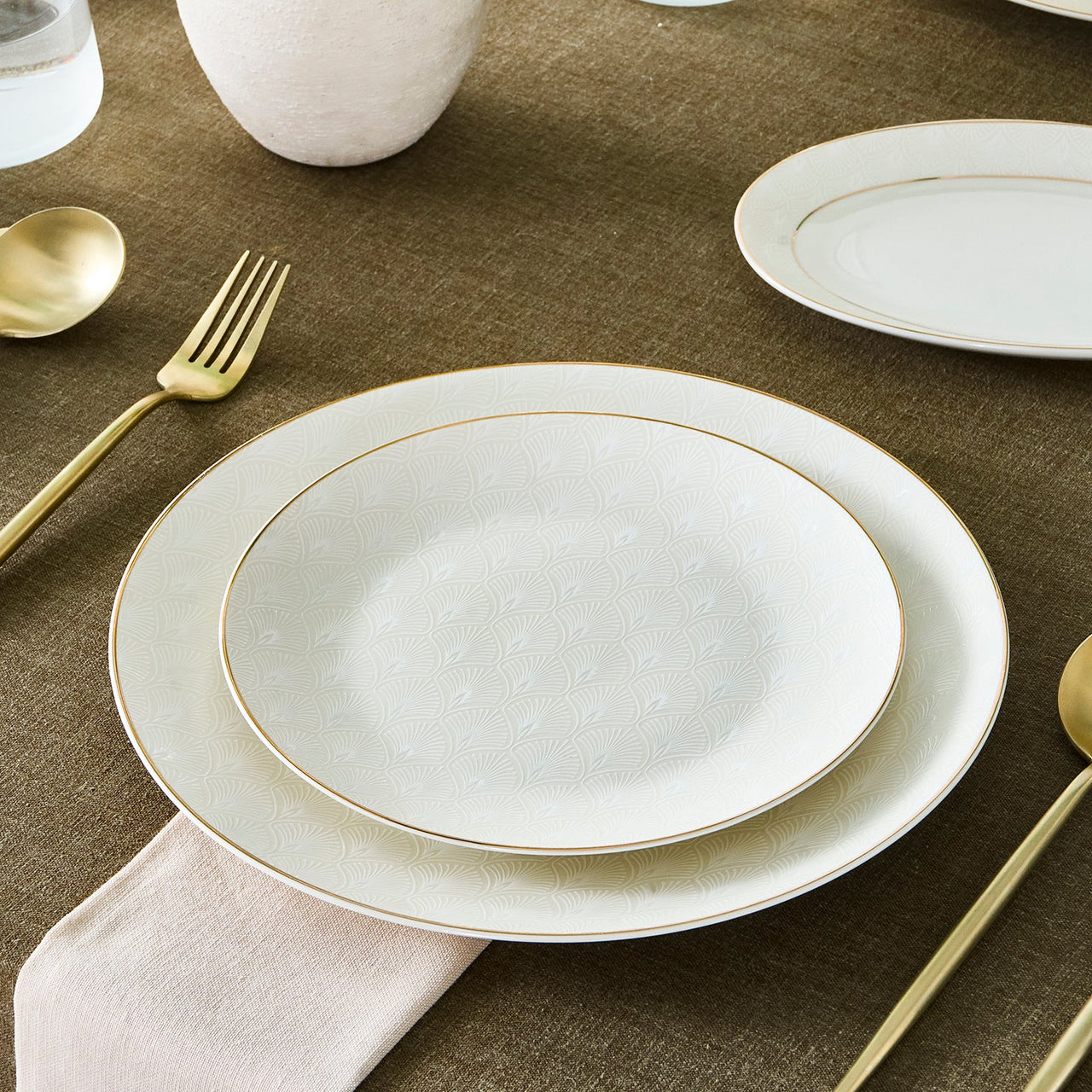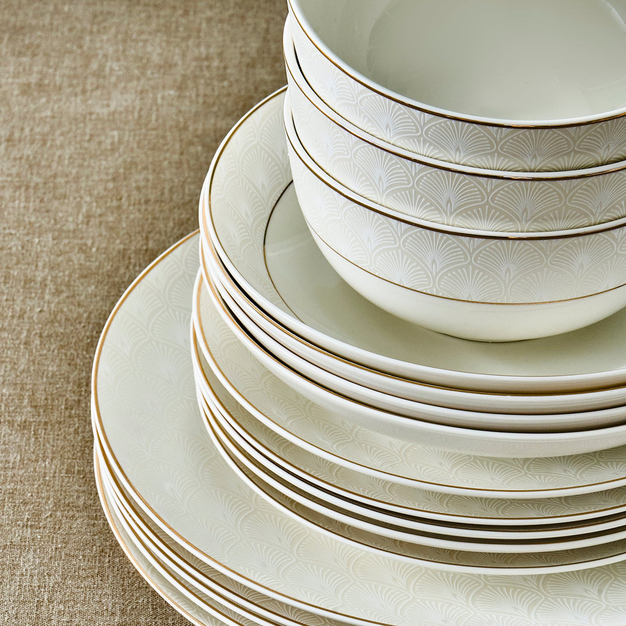 Funktionalität – ideal für stilvolle Tischpräsentationen bei besonderen Anlässen. Gefertigt aus feinstem Bone China mit edlen Goldakzenten bietet das Set eine harmonische Farbgestaltung und ein umfangreiches Sortiment für 12 Personen.