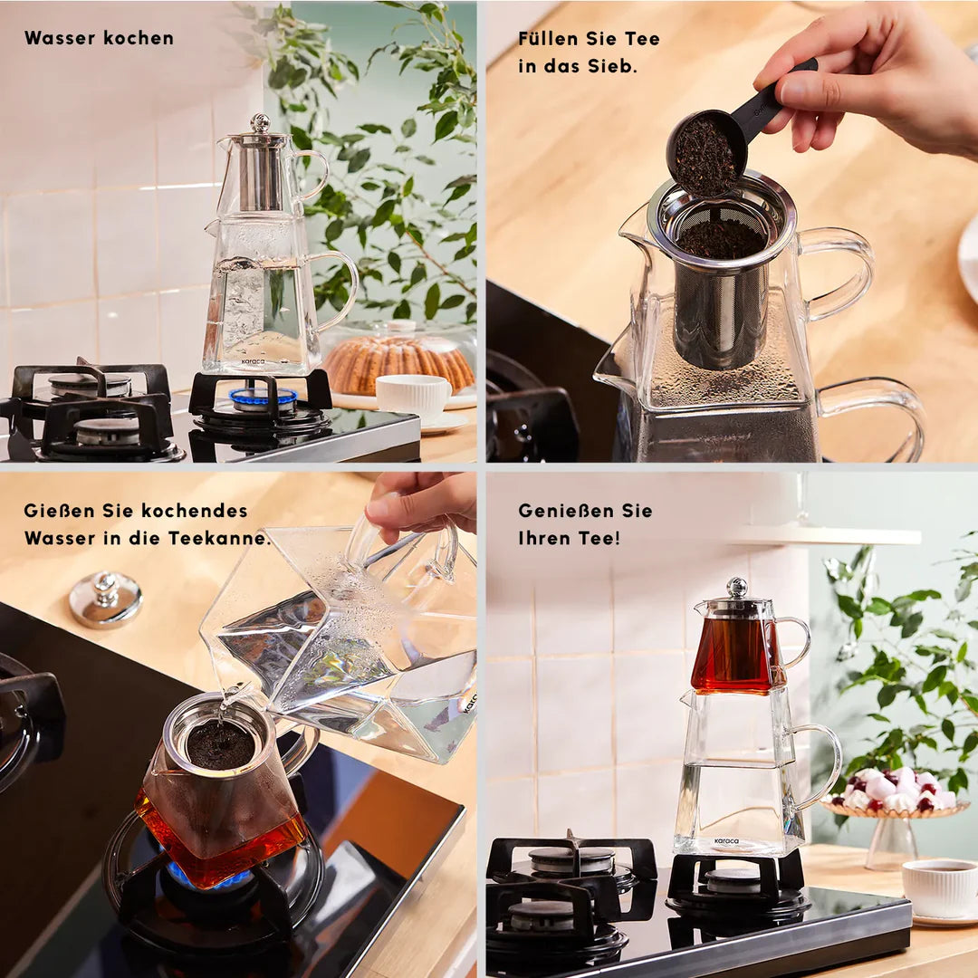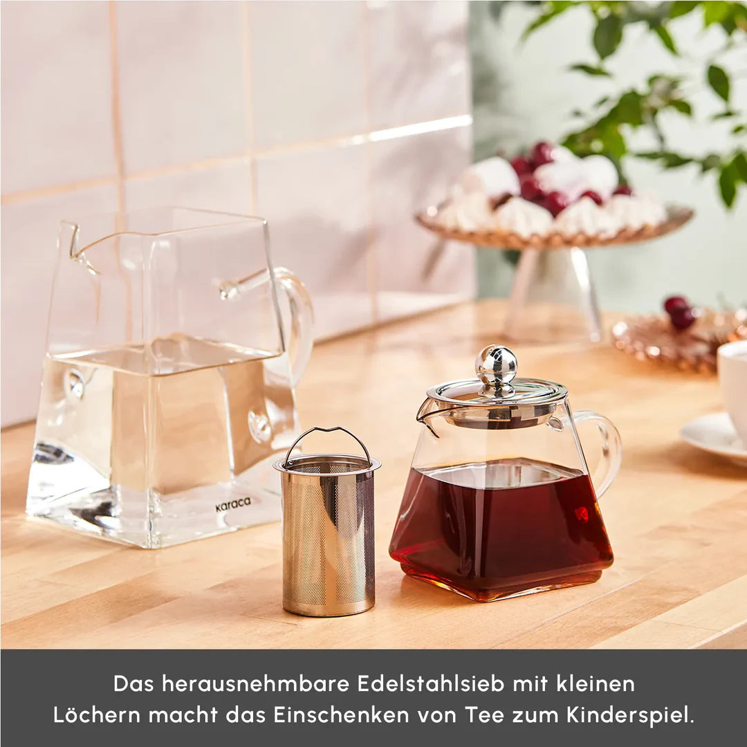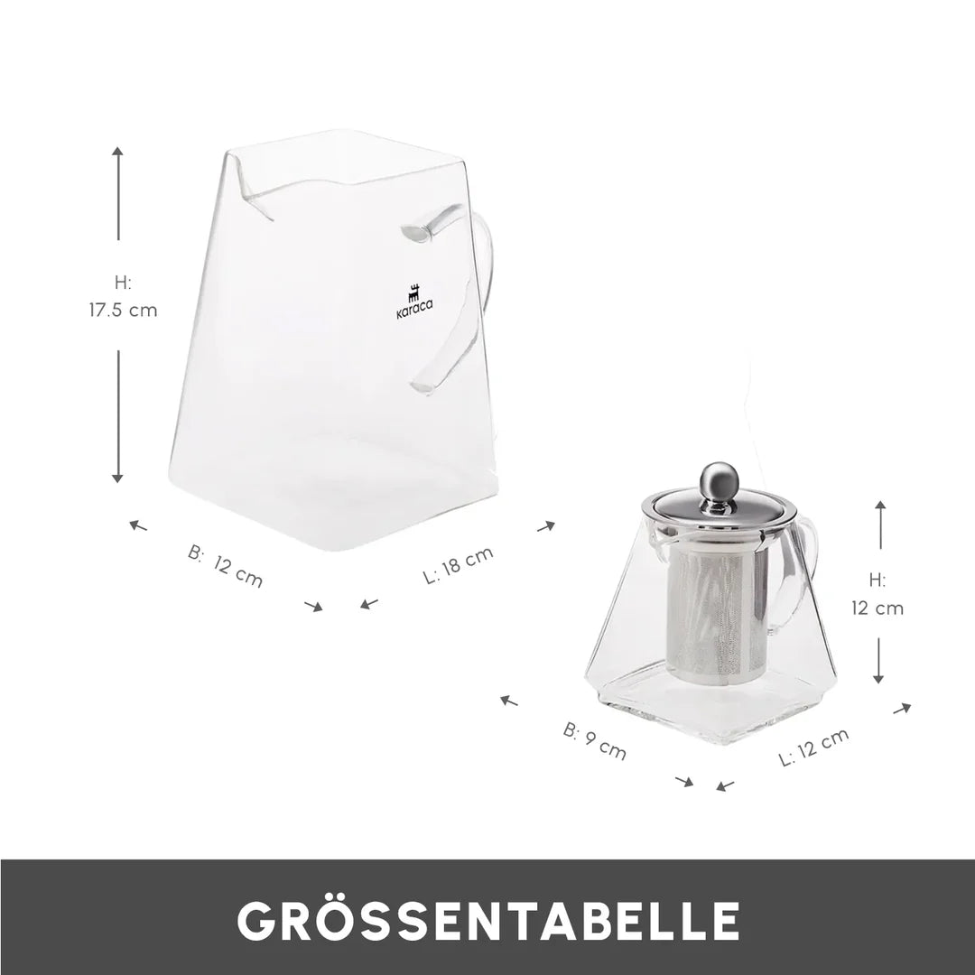 Die Karaca Giza Teekanne ist eine elegante, gläserne Teekanne, die sich perfekt für stilvolles Teetrinken eignet. Mit ihrem modernen Design und der transparenten Glasoberfläche können Sie den Teeblattaufguss in seiner vollen Pracht beobachten. Ideal für Teeliebhaber, die Wert auf Qualität und Ästhetik legen. Die Teekanne hat ein Fassungsvermögen von obere Kanne 450 ml, untere Kanne 1500 ml und lässt sich durch den ergonomischen Griff komfortabel handhaben. Sie ist sowohl für den täglichen Gebrauch als auch für besondere Anlässe geeignet.