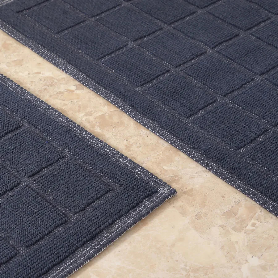 Verleihen Sie Ihrem Badezimmer mit dem Karaca Home Kelly Quatre Mattenset in Indigo einen Hauch von Eleganz und Komfort. Dieses 2-teilige Set besteht aus zwei Matten in den Größen 50 x 80 cm und 50 x 40 cm, gefertigt aus 100% hochwertiger Baumwolle. Die weiche und saugfähige Textur sorgt für ein angenehmes Gefühl unter den Füßen und trägt zu einem luxuriösen Badeerlebnis bei. Dank der maschinenwaschbaren Eigenschaft und der Eignung für den Trockner ist die Pflege dieser Matten mühelos. Das stilvolle Indigo-Design fügt sich nahtlos in verschiedene Badezimmereinrichtungen ein und setzt dabei moderne Akzente.