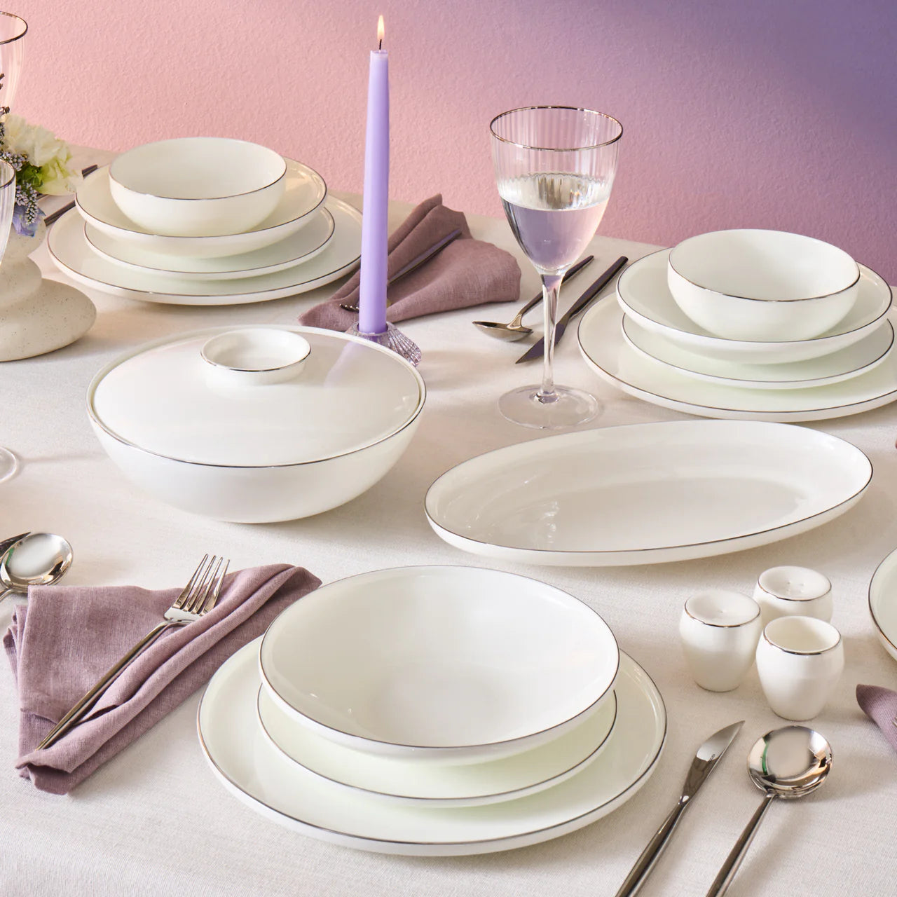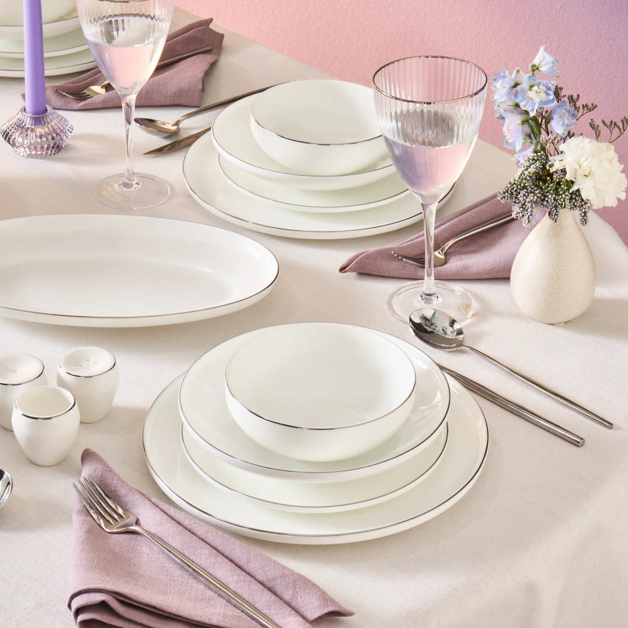 Das New Meridian Platin Geschirrset überzeugt mit seiner edlen Optik und exzellenten Qualität für bis zu 12 Personen. Hergestellt aus feinem, langlebigem Fine Bone Material, vereint dieses Set Eleganz und Funktionalität in einem. Das moderne Design mit platinfarbenem Rand verleiht Ihrer Tischdekoration einen luxuriösen Touch – ideal für festliche Anlässe und stilvolle Dinnerabende. Das Set ist spülmaschinengeeignet (bei niedriger Temperatur) und abriebfest. Dank seiner besonders glatten Oberfläche ist es unempfindlich gegenüber Kratzern und behält auch bei häufiger Nutzung seinen edlen Glanz.