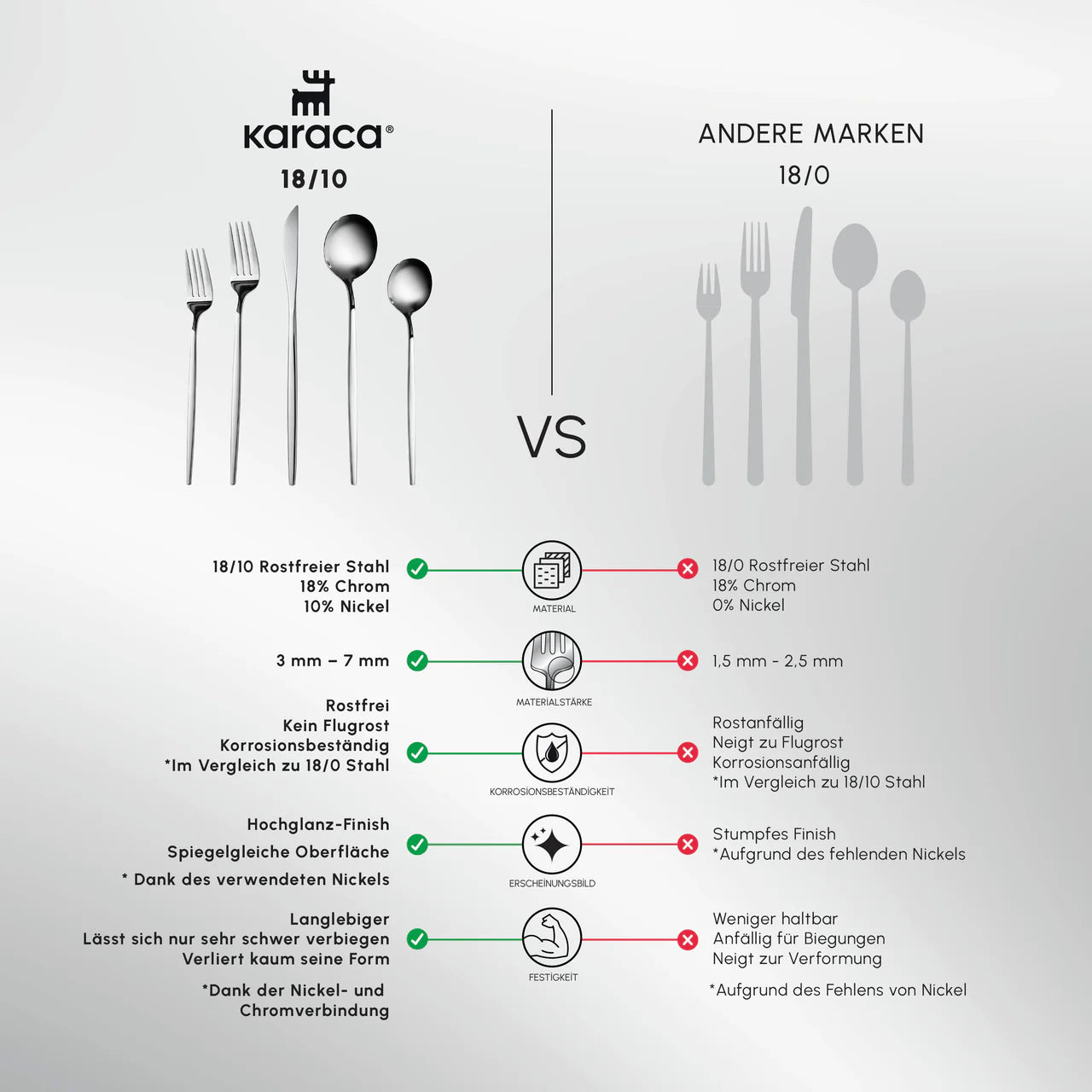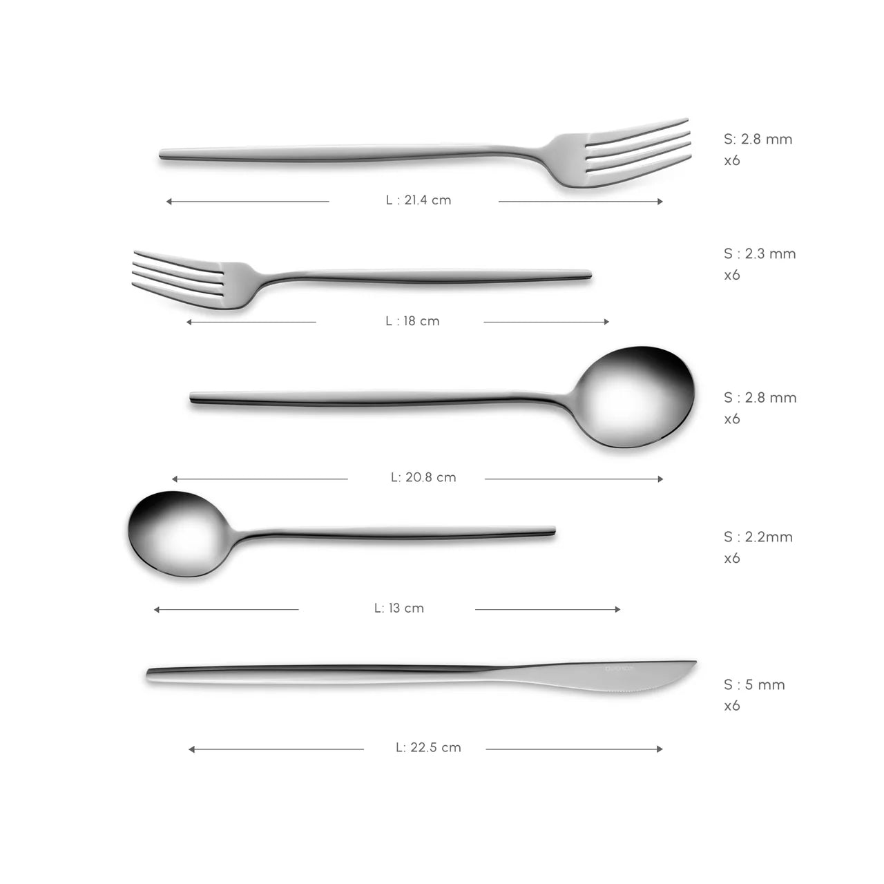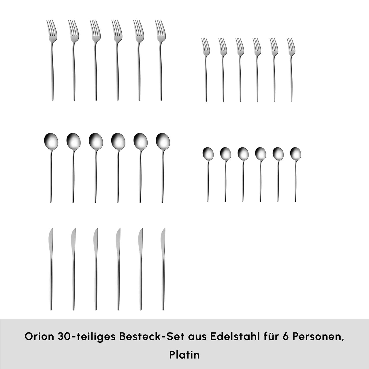 Das Orion Platin Besteckset verleiht jedem gedeckten Tisch eine moderne und luxuriöse Note. Mit seinem eleganten Design in edlem Platin-Finish ist es ideal für festliche Anlässe und stilvolle Dinner zu Hause. Die ergonomisch geformten Griffe sorgen für angenehmen Halt und eine komfortable Handhabung. Das 30-teilige Set ist für 6 Personen ausgelegt und überzeugt durch Langlebigkeit, Qualität und Ästhetik – perfekt für den täglichen Gebrauch sowie besondere Momente.