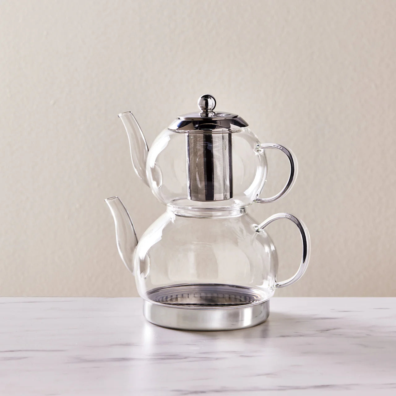 Dank seiner 18/10 Cr-Ni Edelstahlstruktur ist das Karaca Stahl-Teekessel-Set äußerst langlebig, bietet eine gesunde Nutzung und sorgt für köstlich gebrühten Tee. Es besteht aus einer 1-Liter-Teekanne und einem 2-Liter-Wasserkessel. Mit seinen hitzebeständigen Griffen ermöglicht es ein einfaches Einschenken.