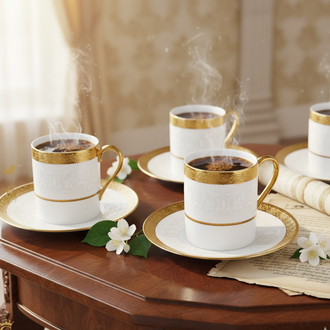 Verleihen Sie Ihrer Kaffee-Genusszeit einen Hauch von Eleganz mit dem Karaca Royal Bone Victoria Kaffeetassenset für 6 Personen (je 90 ml).